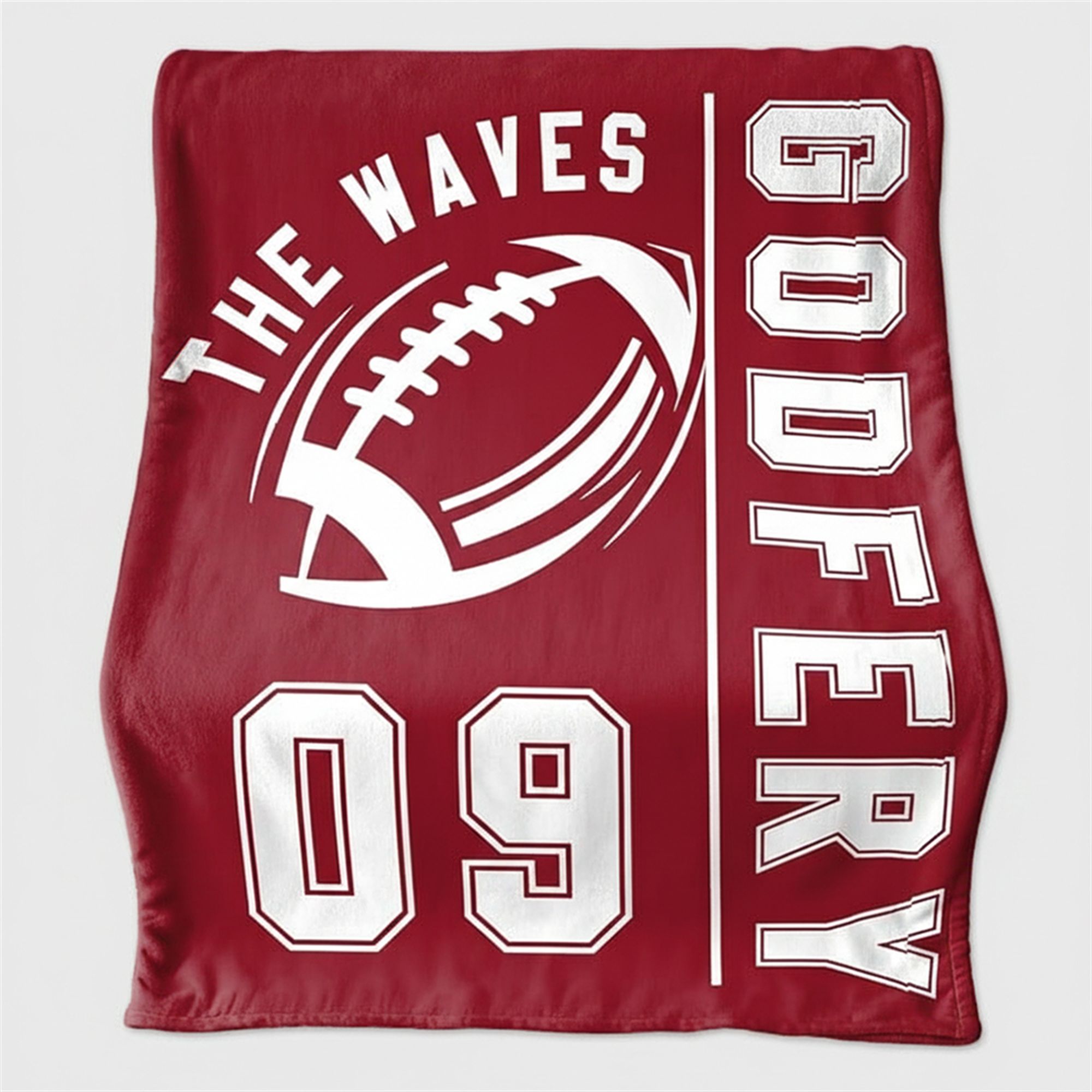 The blanket is designed for the superfan who wants to showcase their passion loud and clear. This product features a rich, deep red background that serves as the perfect canvas for the oversized, athletic-style graphics. Dominated by a stylized American football emblem and the text “THE WAVES” arcing overhead, the design channels classic varsity energy. The vertical “GODFREY” lettering and the prominent “09” jersey number anchor the visual, making it an instant conversation starter. It is sized perfectly to be a versatile addition to any room, serving as a bedspread accent, a wall hanging, or a game-day companion.