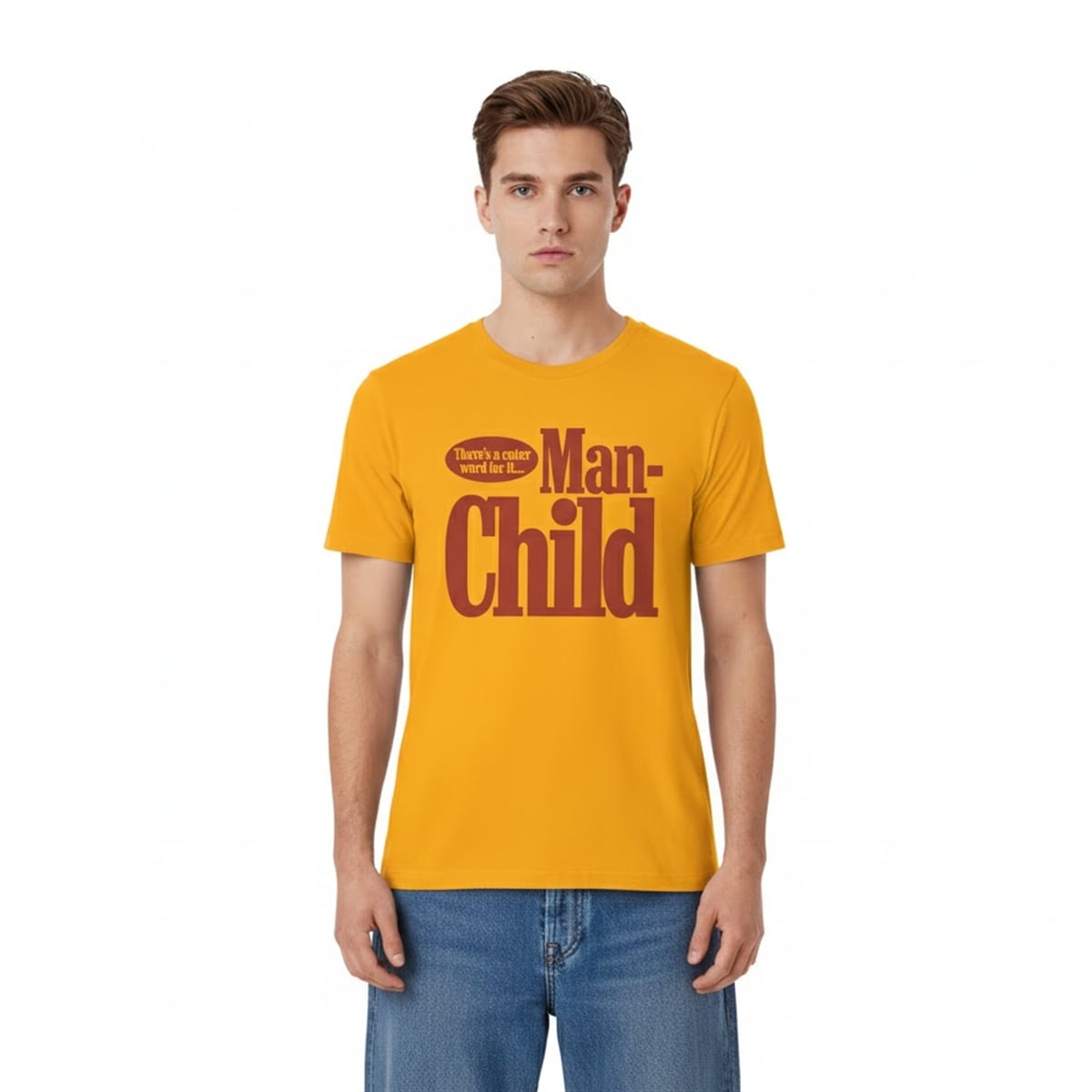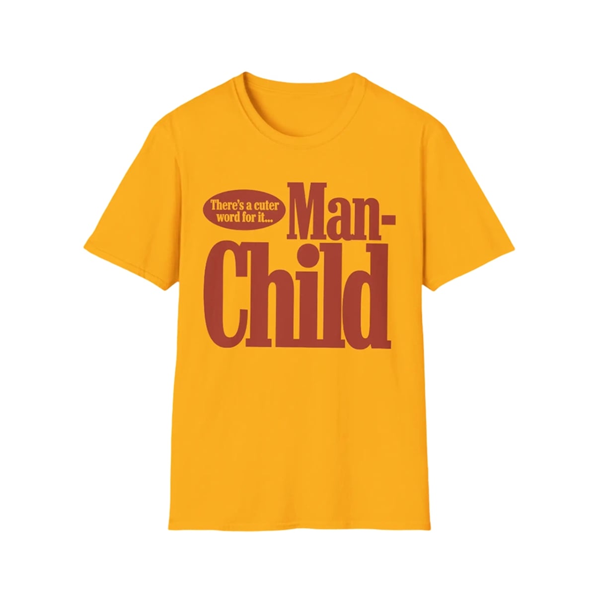 The text on this vibrant yellow shirt reads, “There’s a cuter word for it… Man-Child.” To understand the appeal, you have to look at the brilliant contrast in the phrasing. The setup, “There’s a cuter word for it,” lulls the reader into expecting a sweet, endearing term for someone’s boyish charm. Instead, it delivers a bluntly funny punchline: “Man-Child.”