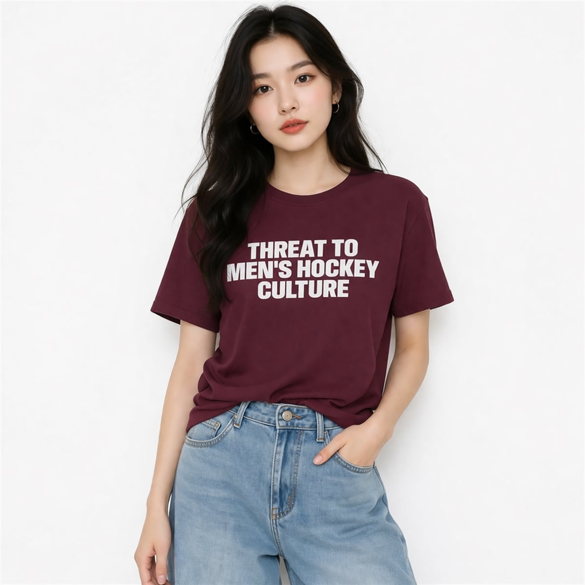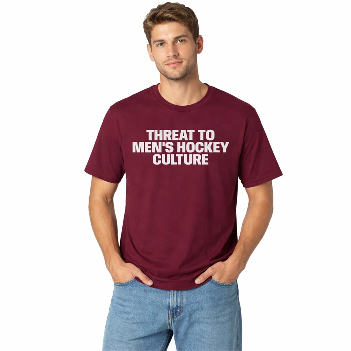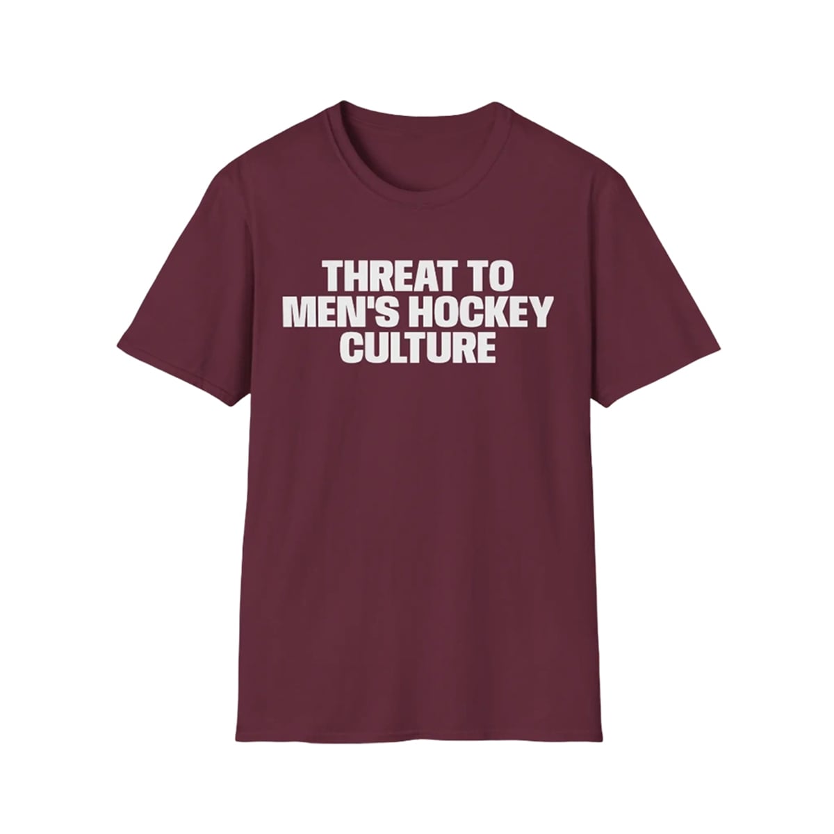 In a sports world increasingly driven by the push for equity and representation, what you wear can be just as impactful as what you say. The shirt is a visually striking, text-based garment that features crisp, stark white typography set against a deep, rich burgundy background. The sans-serif font “Threat to Men’s Hockey Culture” is intentionally blocky and unmissable, ensuring the message can be read from across a crowded arena or through a smartphone screen on social media.