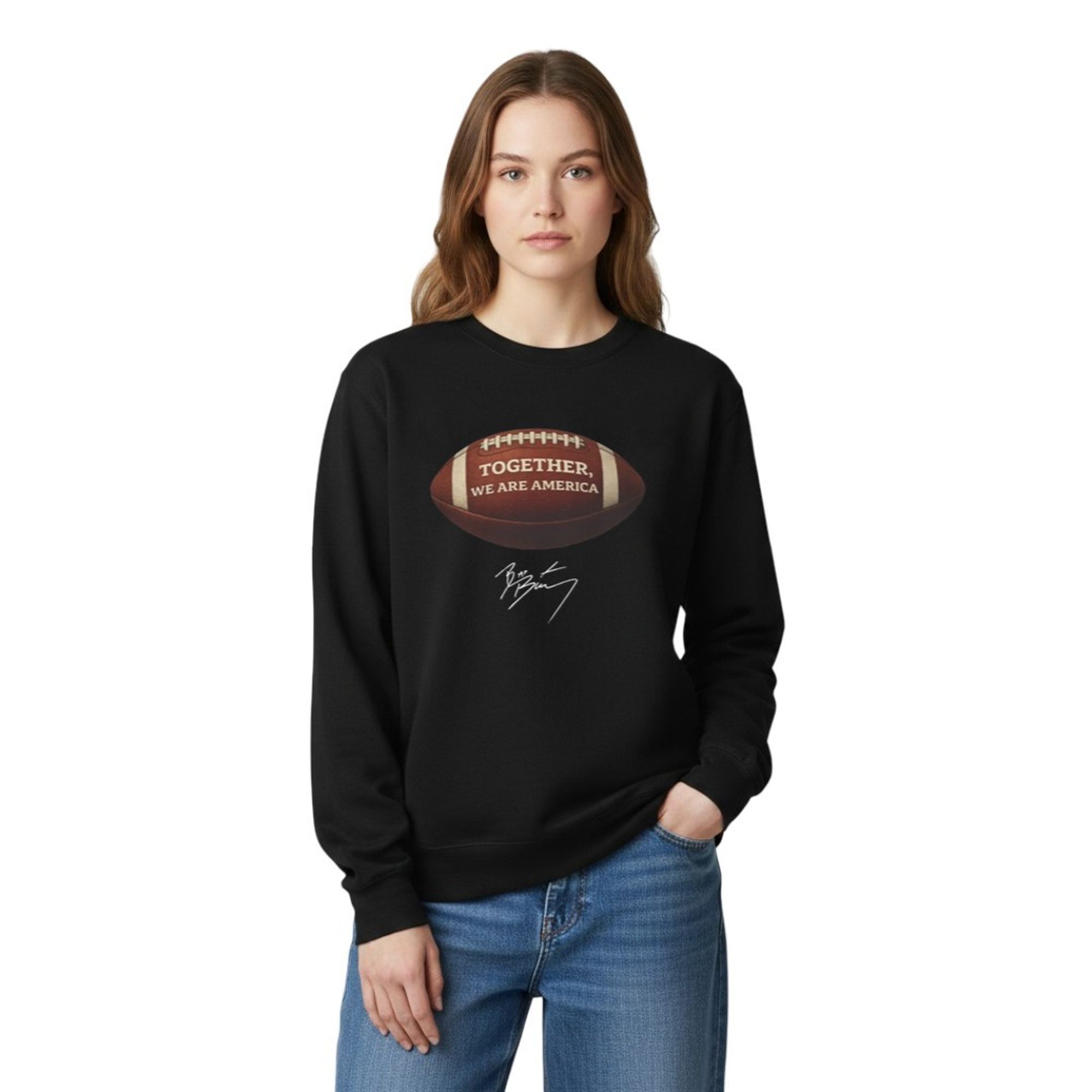 The shirt is a striking piece of merchandise that bridges the gap between the energy of the Super Bowl and the rhythmic soul of Latin Trap. At its center lies a classic American football, a symbol of the nation’s most beloved pastime. Superimposed on the ball is the rallying cry, “TOGETHER, WE ARE AMERICA,” a phrase that echoes the sentiments of inclusivity and shared identity. Below this powerful imagery sits the stylized signature of Bad Bunny, verifying the shirt’s connection to the Puerto Rican phenomenon who has redefined global music charts.