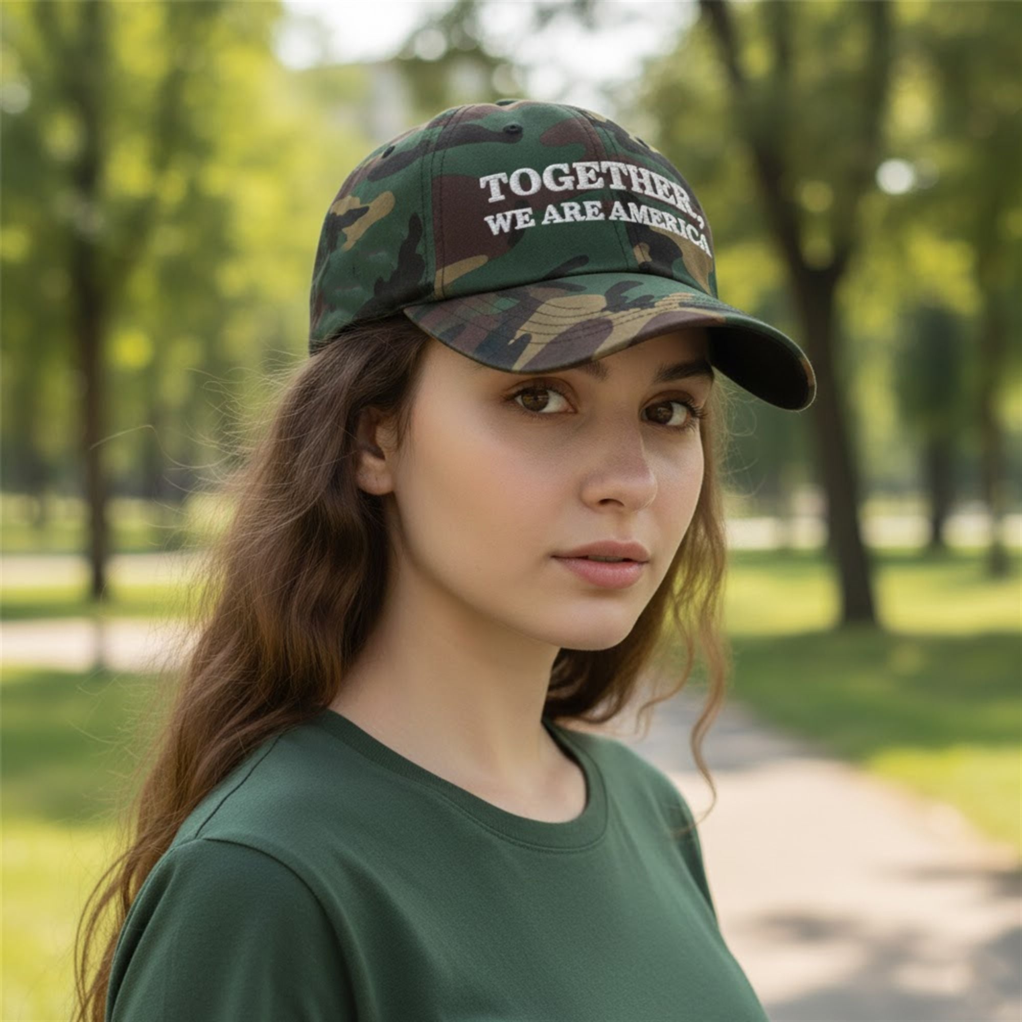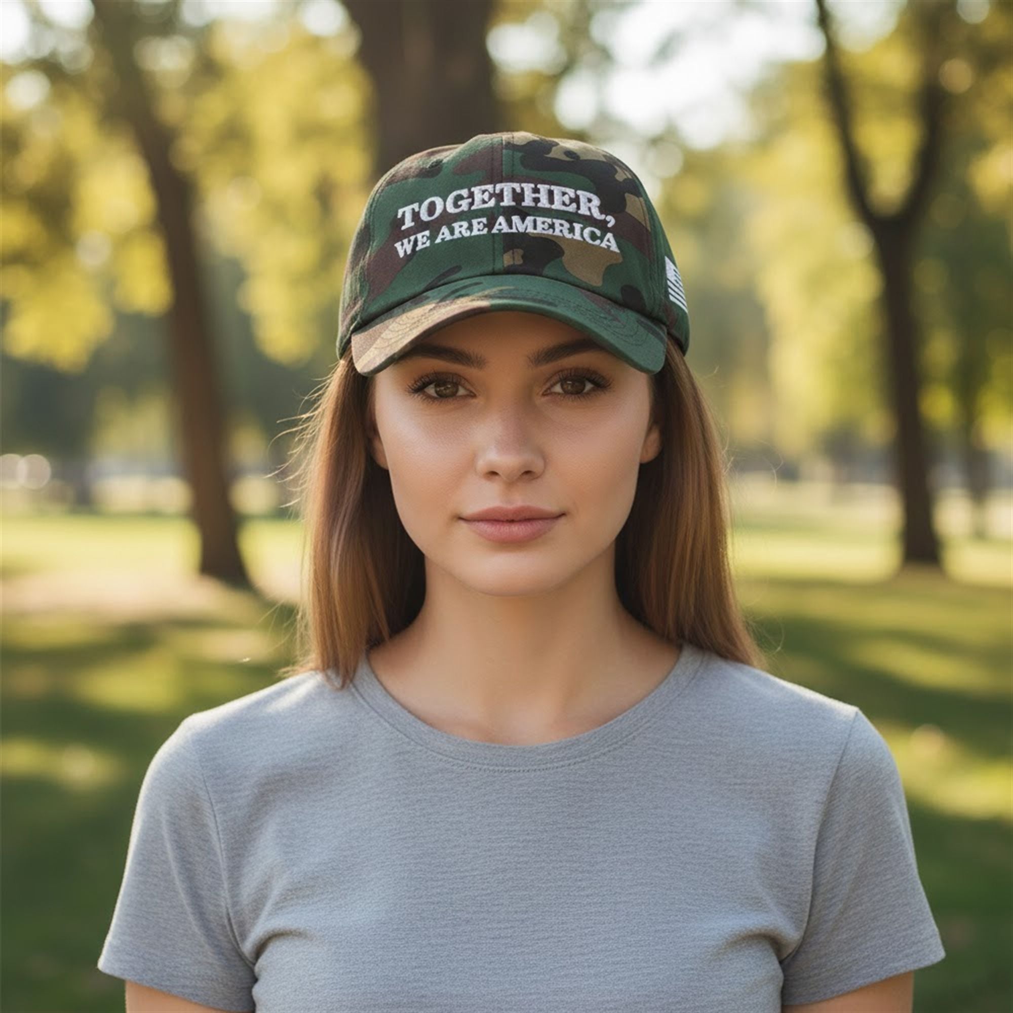 This headwear features a classic woodland camouflage pattern, a staple in both military tradition and modern streetwear. The front panel proudly displays the phrase “TOGETHER, WE ARE AMERICA” in bold, white serif lettering, ensuring the message is legible and impactful from a distance. The side of the cap features a distinct, monochromatic American flag emblem, adding a tactical edge to the design.