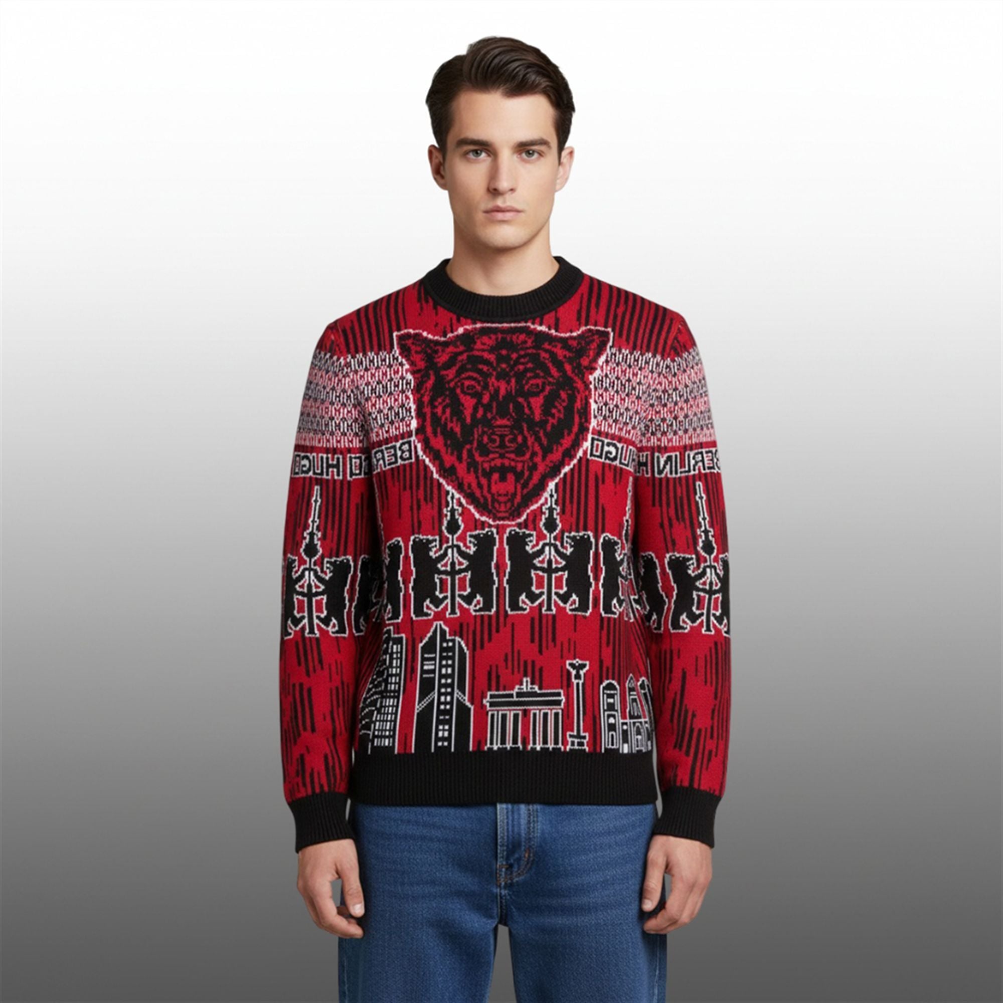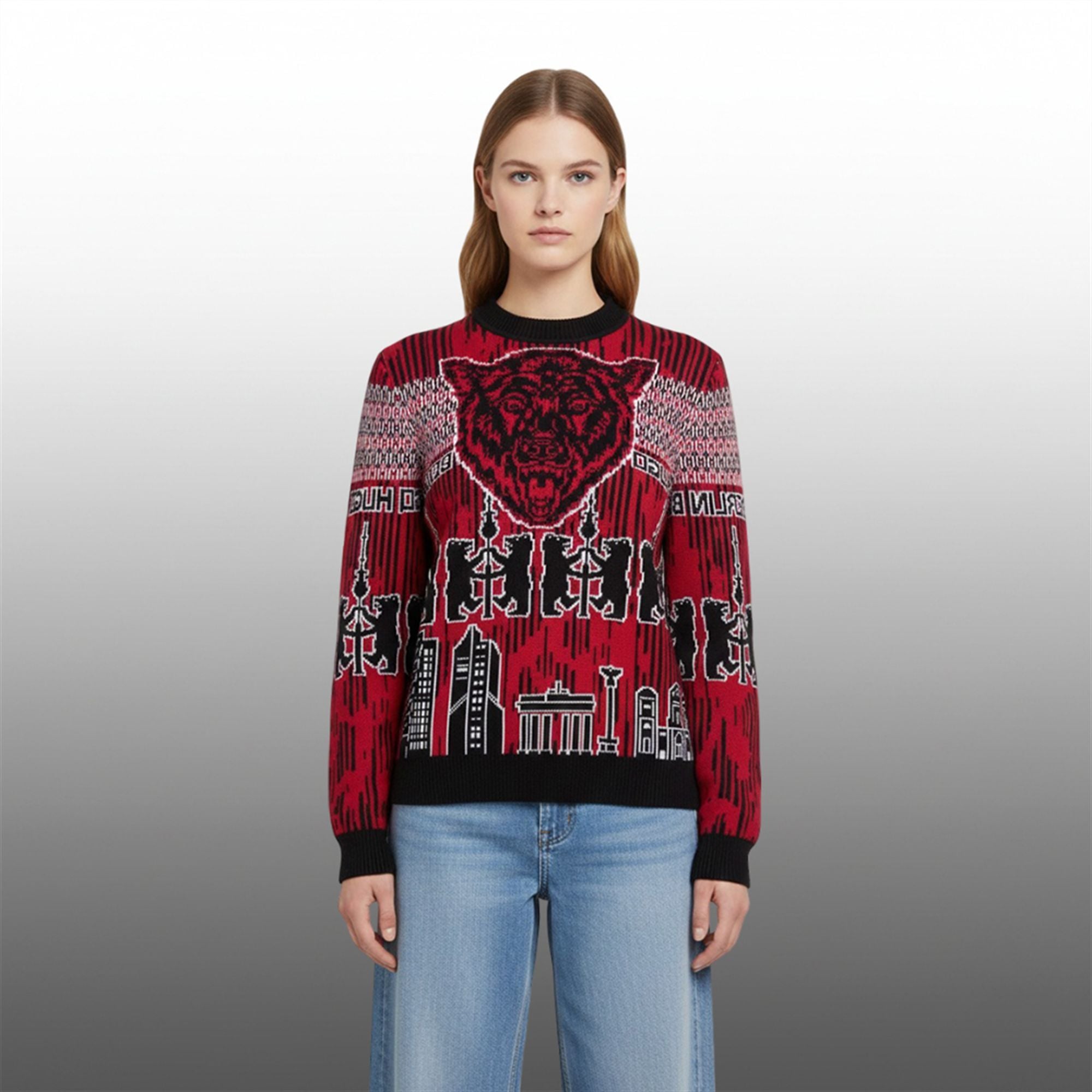 The sweater features a dominant, stylized “Crazy Bear” (the symbol of Berlin) roaring at the center, flanked by an intricate Fair Isle pattern that incorporates the city’s most famous landmarks. It is knitted from a soft, designed to keep you warm during cold winter match days or cozy holiday gatherings. It’s not just a sweater; it’s a piece of football culture and a nod to one of the game’s greatest playmakers.