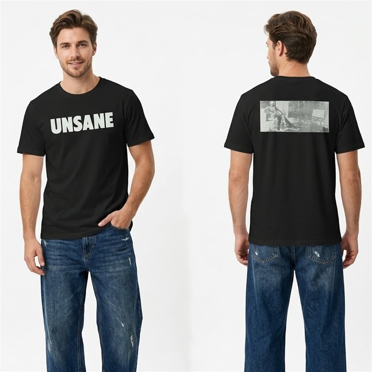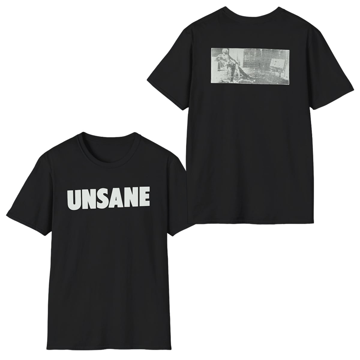The shirt is a masterful blend of stark typography and haunting imagery. The front of the garment features the word “UNSANE” in heavy, distressed block lettering that demands immediate attention. Turning the shirt reveals a gritty, black-and-white graphic of a figure in a bleak room, perfectly capturing an industrial, underground aesthetic.