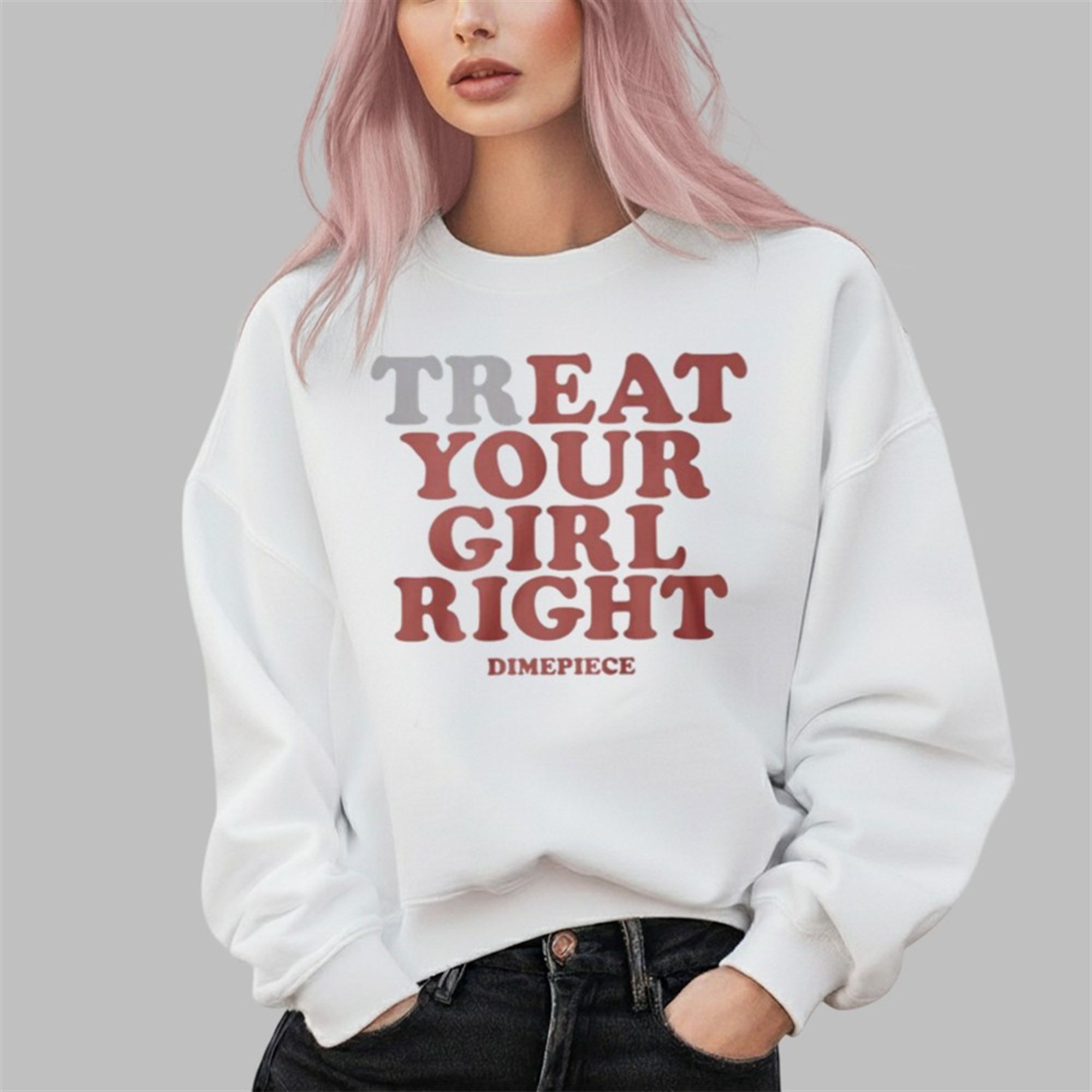 The striking graphic features the phrase “TREAT YOUR GIRL RIGHT” printed across the chest in a bold, rounded font reminiscent of vintage collegiate or streetwear designs. The word “TREAT” is styled in a cool, neutral grey, while “YOUR GIRL RIGHT” pops in a deep, sophisticated maroon, creating an aesthetically pleasing contrast that draws the eye. The subtle “DIMEPIECE” text sits centered below the main graphic, providing authentic brand recognition.
