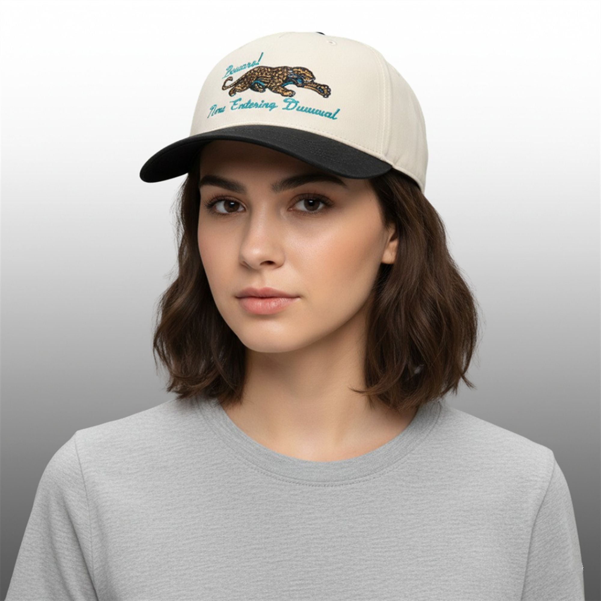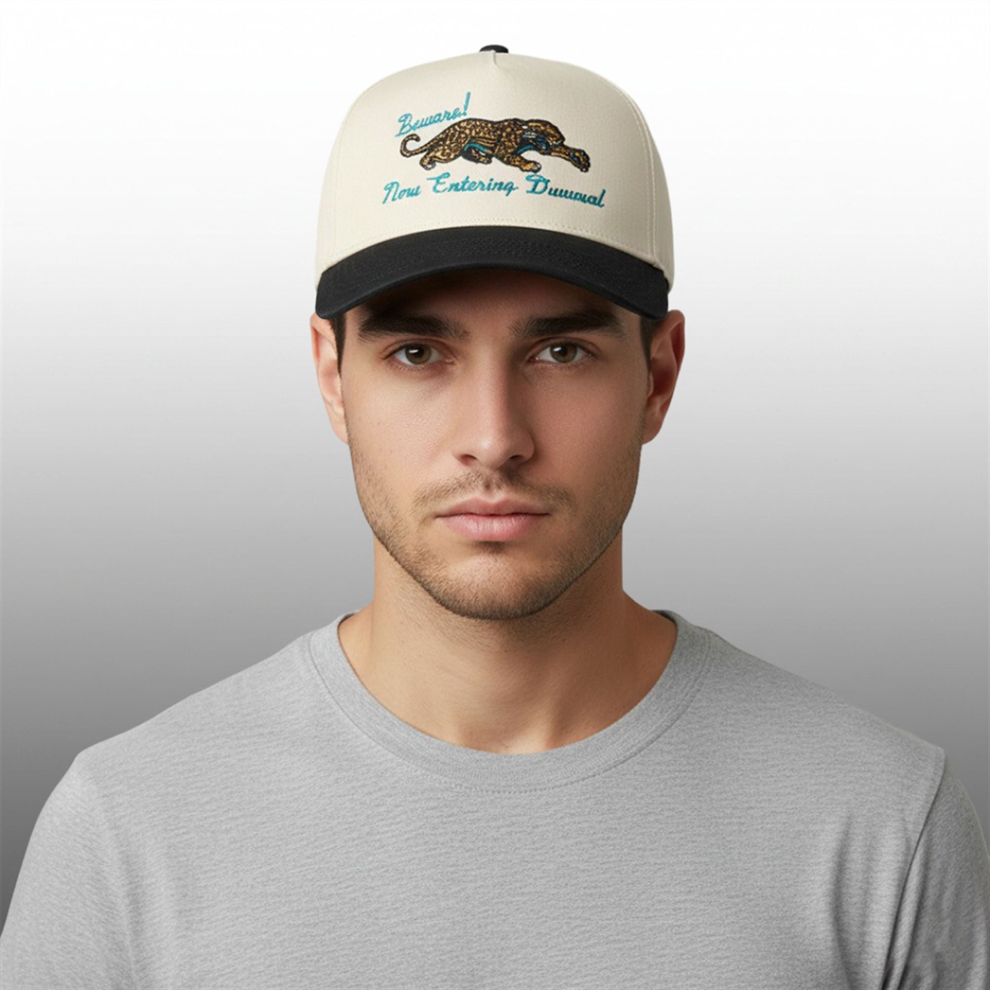 At the center is a ferocious, crouching jaguar in classic gold and black threads—a throwback to the raw, aggressive art styles of the 1990s. Above the beast, the script reads “Beware!”, serving as a playful yet serious notice to opposing teams. Below, the iconic phrase “Now Entering Duuuval” is stitched in a signature teal font, immortalizing the chant that echoes through the stadium every Sunday. The cream-colored crown paired with a contrasting black brim gives it a timeless, “dad hat” vibe that pairs perfectly with vintage tees or modern jerseys.