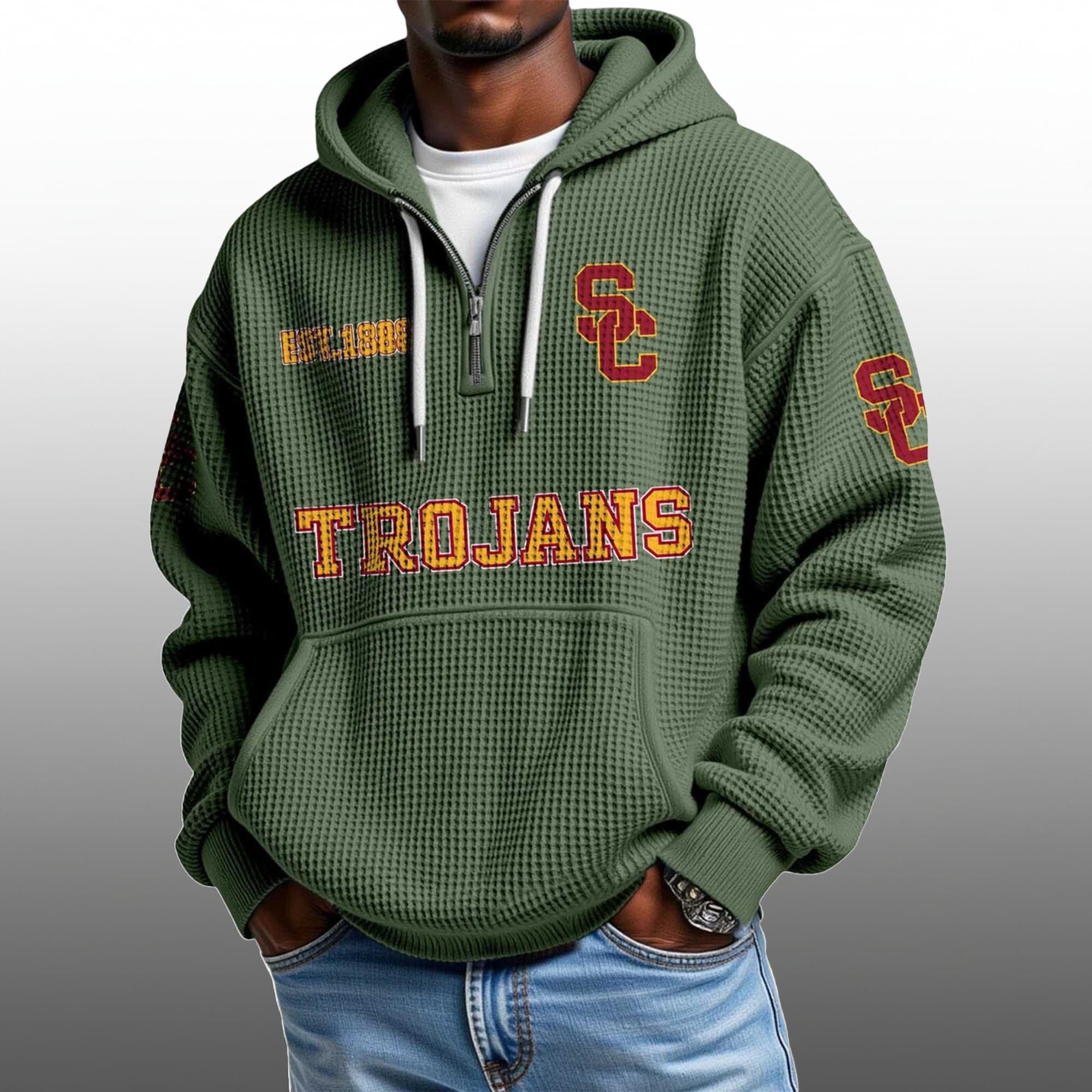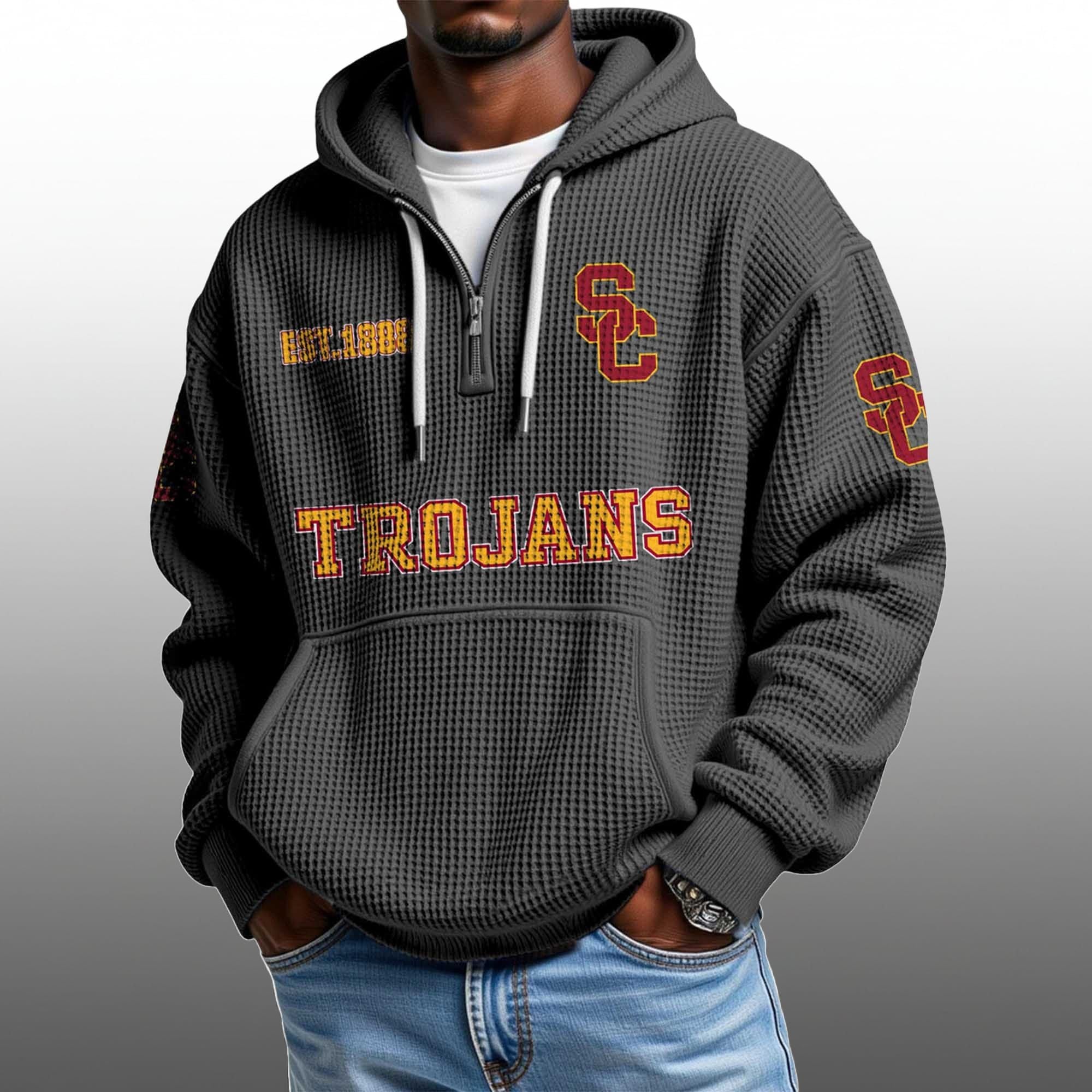 The viral texture trend of December 2025 has arrived in college football fashion with the USC Trojans Heritage Waffle Knit Hoodie. Moving away from flat prints, this architectural quarter-zip combines the “Quiet Luxury” aesthetic with die-hard fandom.