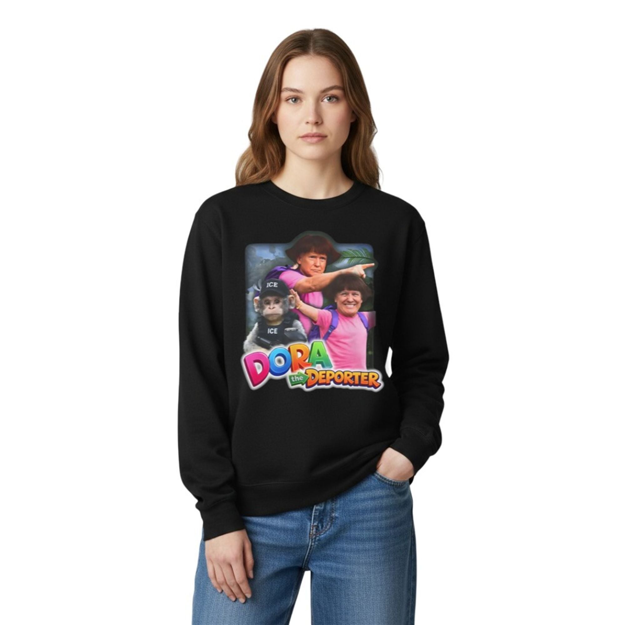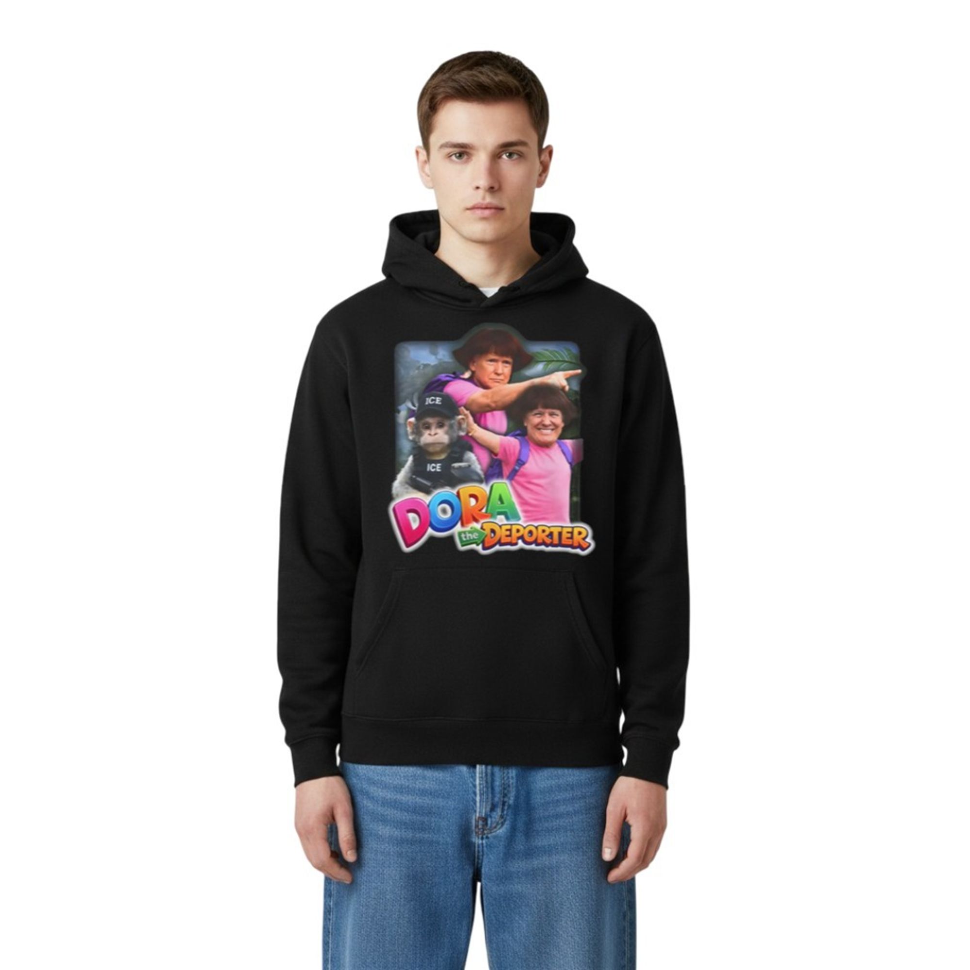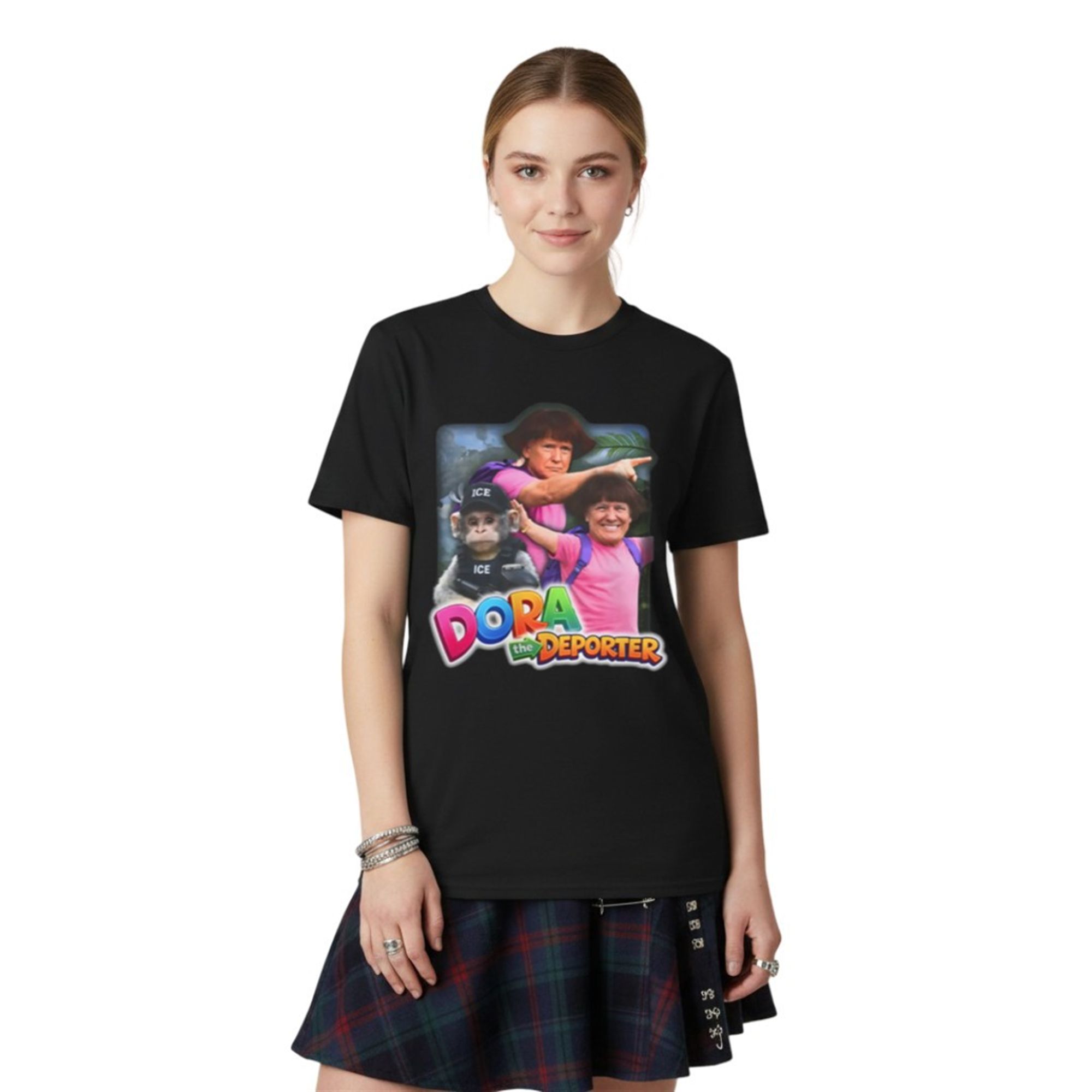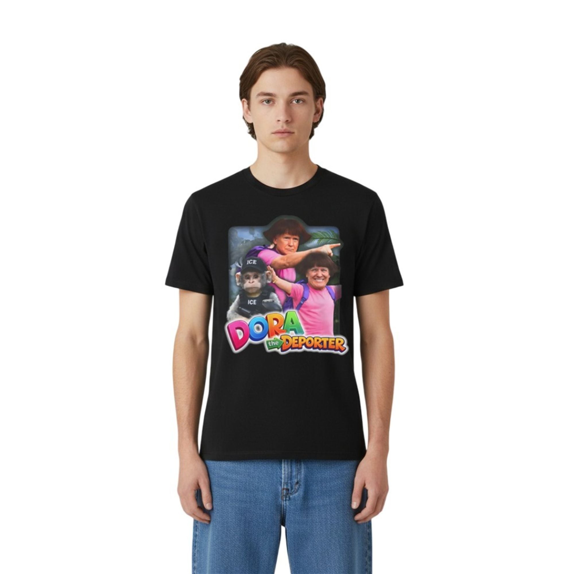 Flanking him is a realistic monkey sidekick, reimagined as a tactical agent wearing a vest and hat emblazoned with “ICE” (Immigration and Customs Enforcement). The background features a lush jungle setting, contrasting sharply with the gritty, satirical text at the bottom that reads “Dora the Deporter” in the classic, colorful 3D font associated with the original show. The visual juxtaposition—innocent childhood imagery versus hard-hitting political themes—creates a jarring, hilarious, and unforgettable image. This product isn’t just about wearing a shirt; it’s about wearing a punchline that resonates with the current era of hyper-viral political content.