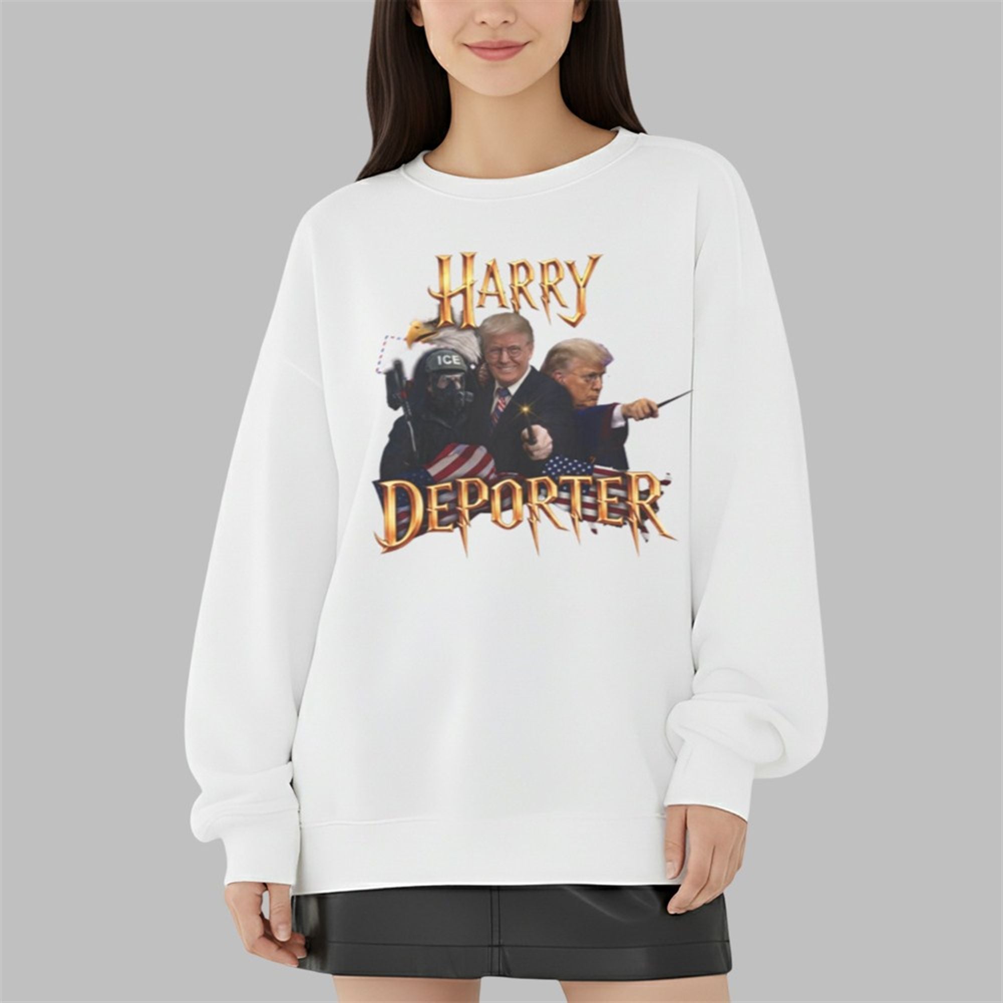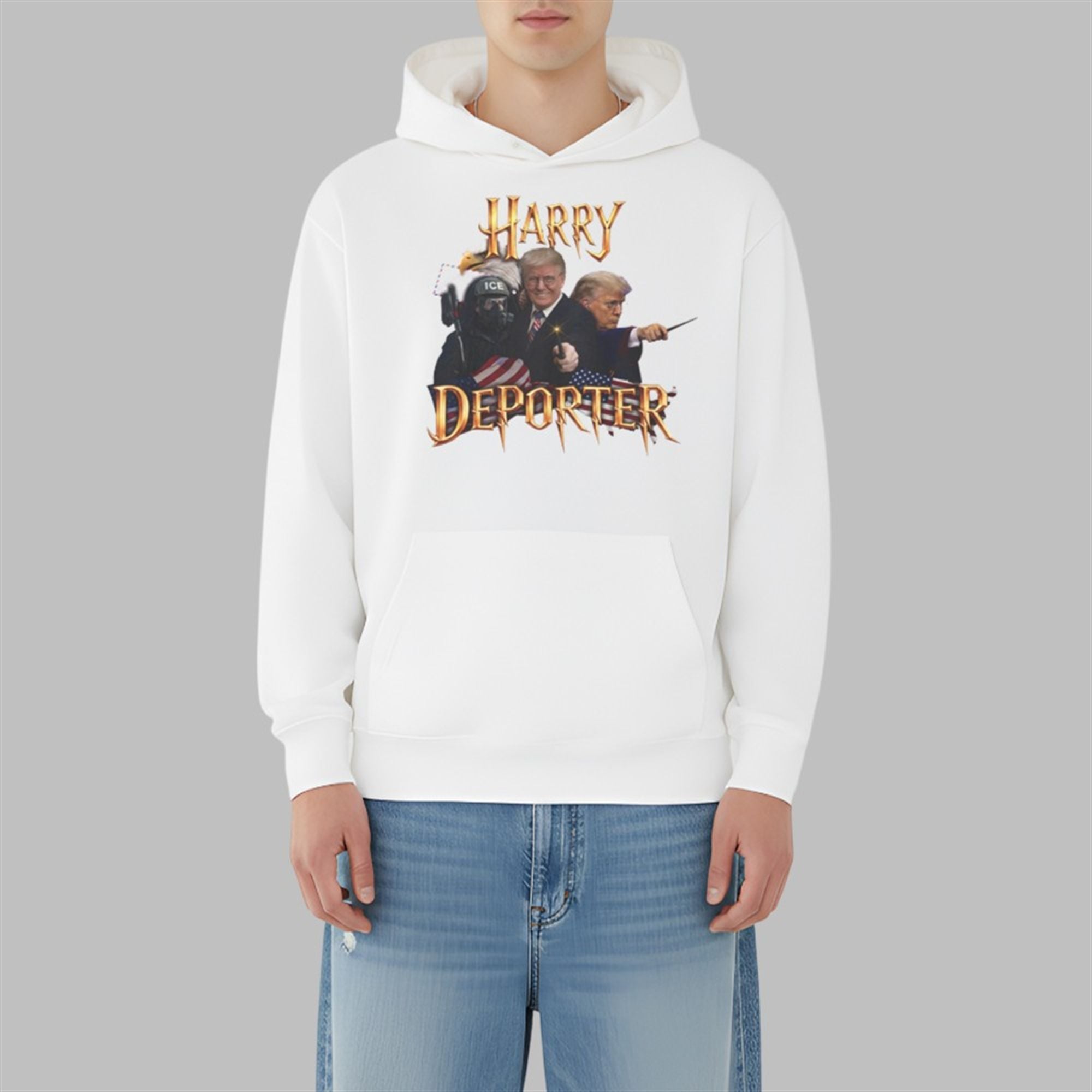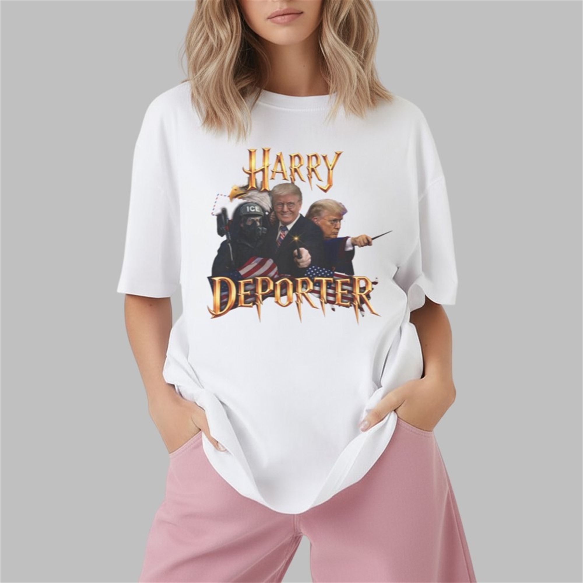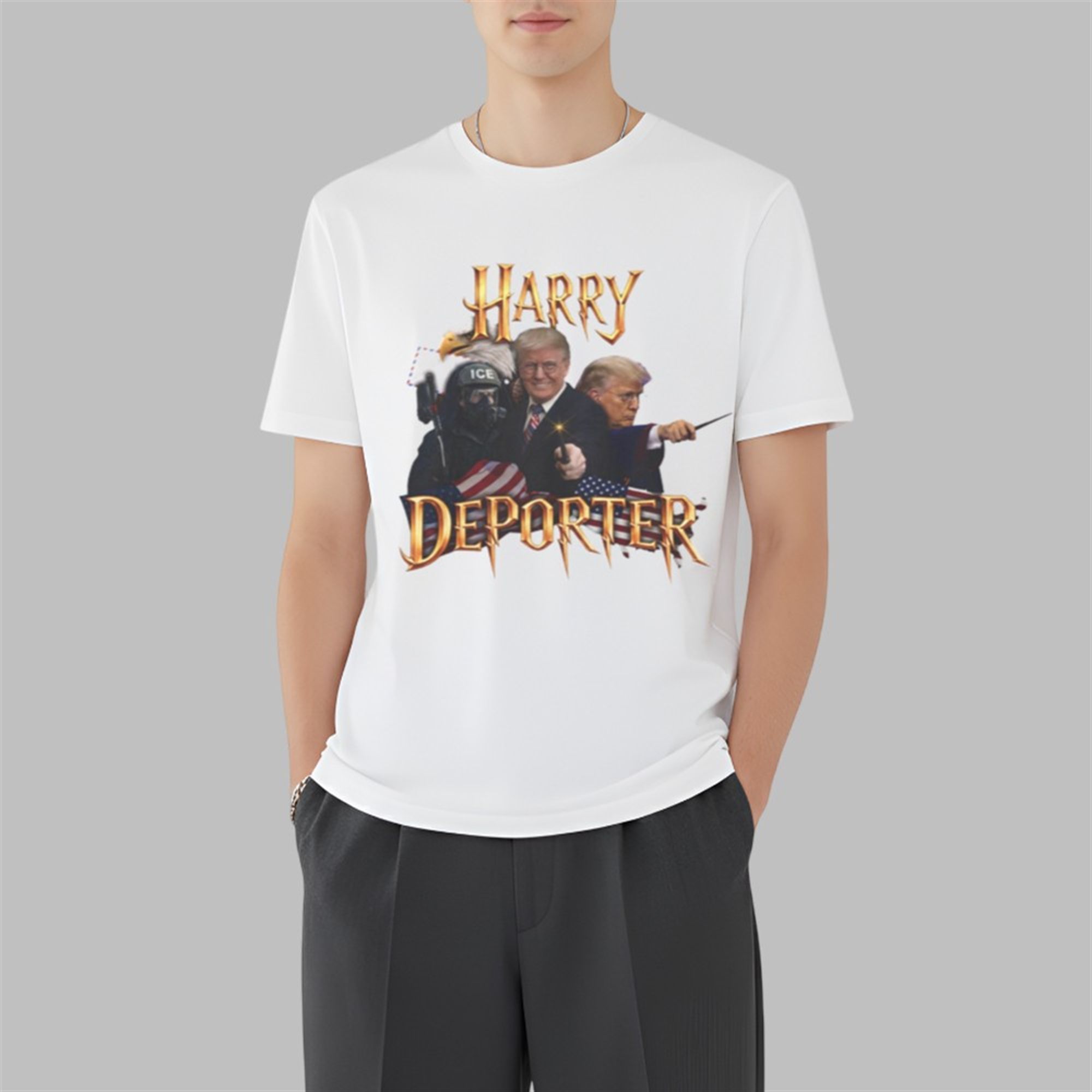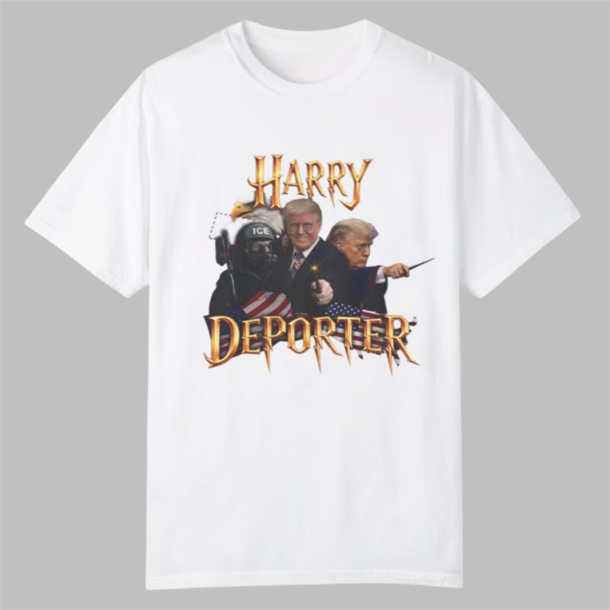 In the landscape of 2026 political apparel, few designs capture the zeitgeist quite like the shirt. This isn’t just a generic slogan tee; it is a complex piece of digital art that layers multiple symbols to tell a story. The design anchors itself with the iconic, jagged gold typography instantly recognizable to fans of the wizarding world, but twists the title into a pun on “Deporter“—a direct nod to immigration policy discussions.