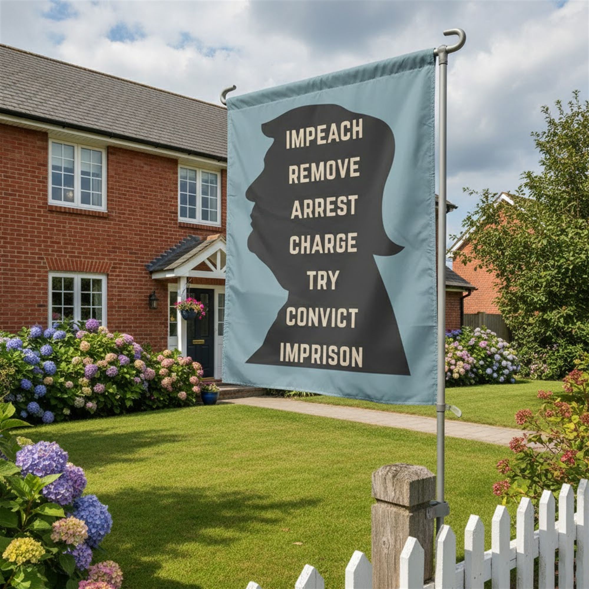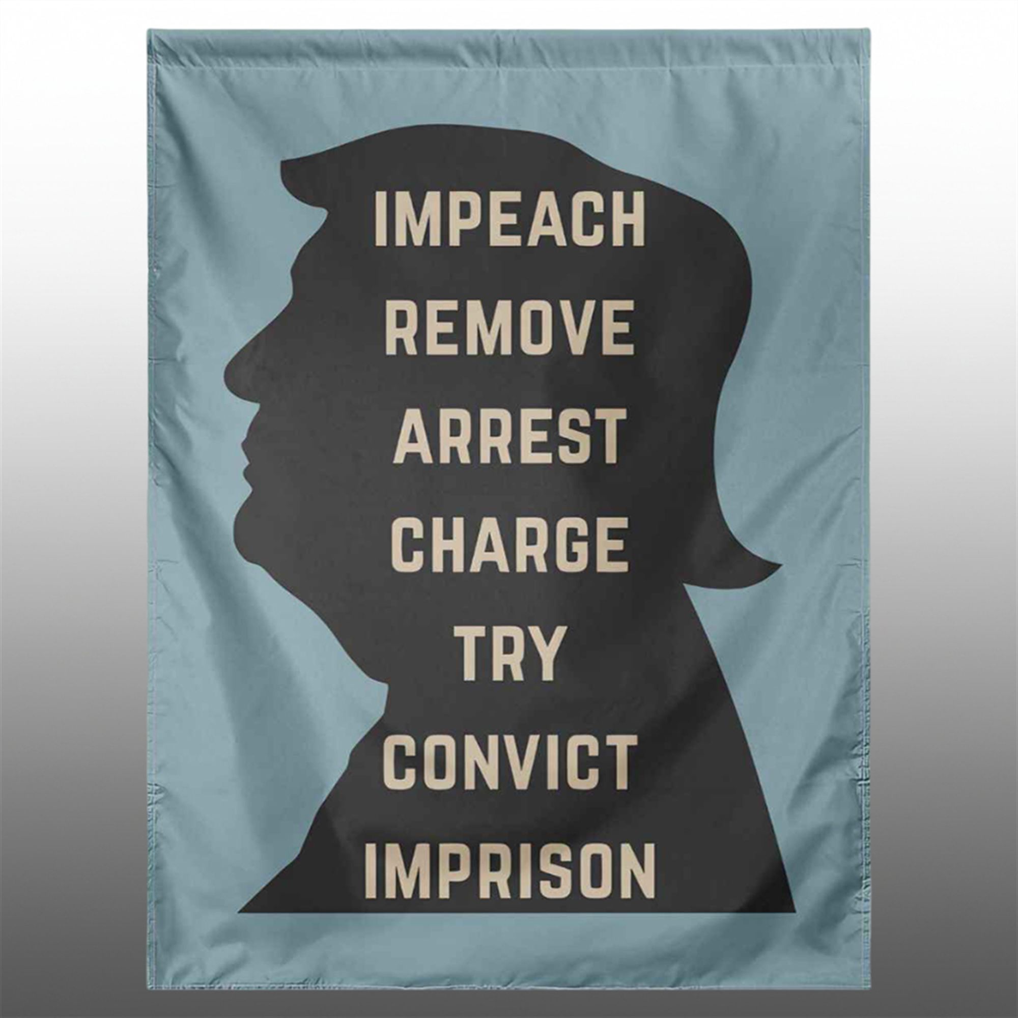 The visual impact of this flag lies in its stark contrast and typographical storytelling. The design utilizes the instantly recognizable silhouette of Donald Trump, using it not to glorify, but to frame a specific narrative of legal consequence. Inside the profile, a vertical stack of keywords—IMPEACH, REMOVE, ARREST, CHARGE, TRY, CONVICT, IMPRISON—creates a ladder of escalating accountability.