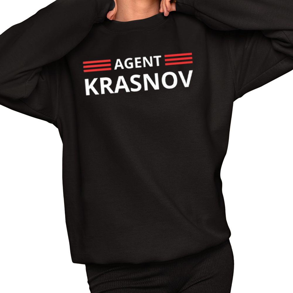 Dive into the world of political parody with our Trump KGB Agent Krasnov Shirt. The shirt prominently features the word “AGENT” above three bold red horizontal lines, immediately followed by the name “KRASNOV” in a clean, impactful font. The design cleverly mimics the aesthetics often associated with KGB imagery, giving it a vintage, almost propaganda-like feel, but with a clear comical twist.