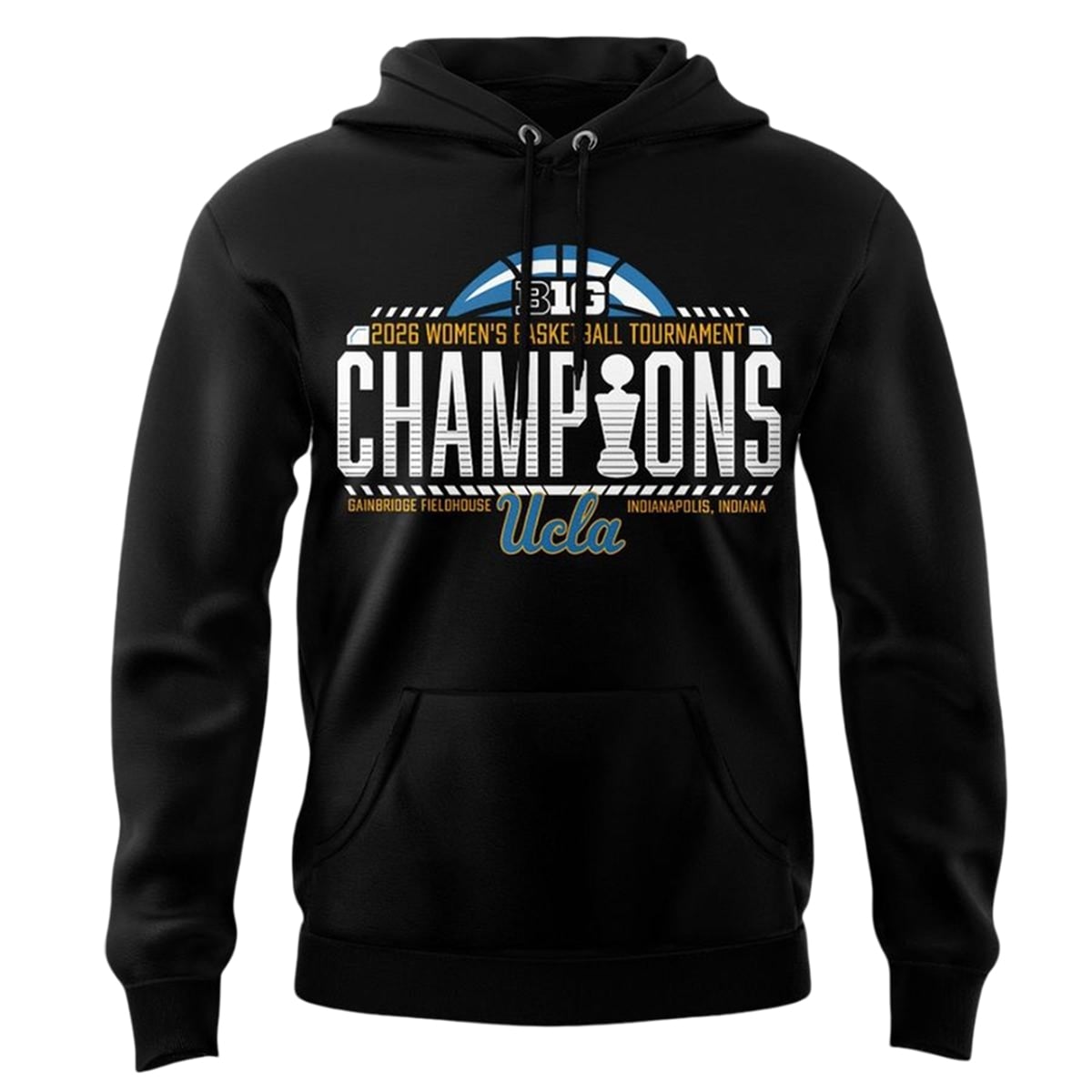 The aesthetic presentation of this hoodie is engineered for maximum visual impact, ensuring that the team’s spectacular achievement takes center stage. The front features an intricate, multi-layered graphic that instantly draws the eye. Anchored by the towering, distressed-style “CHAMPIONS” lettering, the design ingeniously incorporates the championship trophy as the letter ‘I‘. Above this triumphant declaration rests the instantly recognizable Big Ten logo, framed by a stylized basketball motif. Below, the classic script “Ucla” sits proudly alongside the historic venue details: “Gainbridge Fieldhouse – Indianapolis, Indiana.”