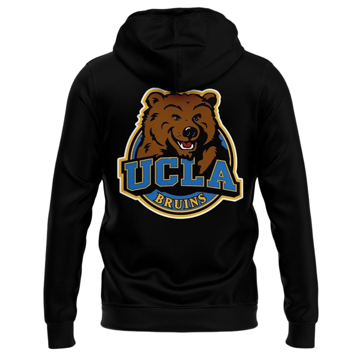 Turning to the back reveals a bold, oversized illustration of the fierce UCLA Bruin bear mascot peering assertively over the classic collegiate shield. The contrasting shades of vivid blue and gold against the deep black background create a stunning, dynamic look that perfectly encapsulates the energy of a championship-winning team.