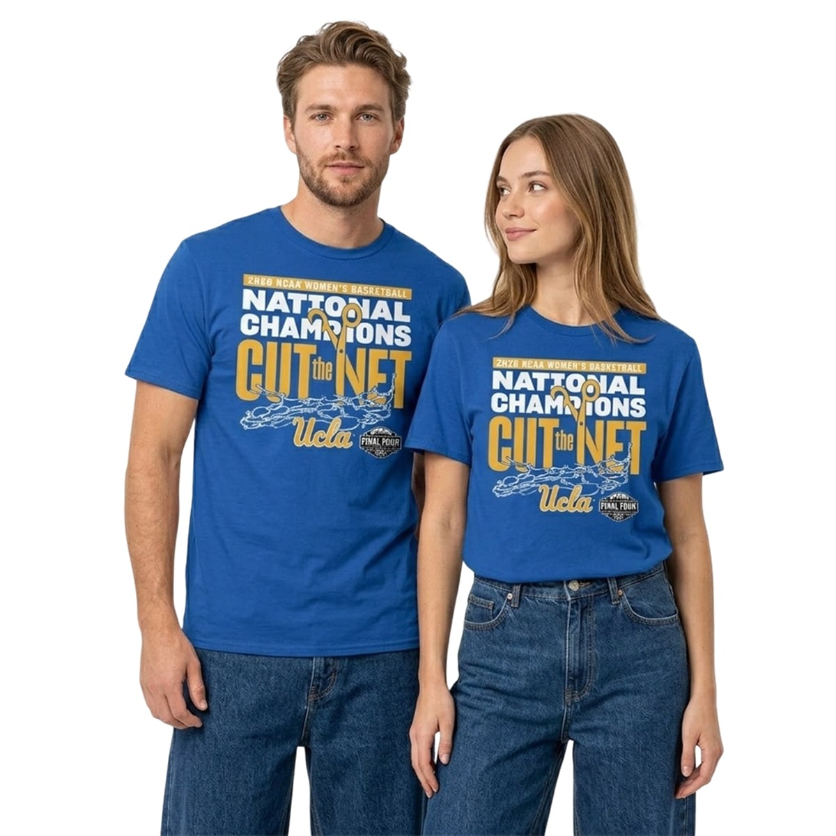 The shirt is a vibrant, visually dynamic piece of sports memorabilia that immortalizes a legendary season. Set against the classic, unmistakable UCLA blue background, the design features bold, block lettering proudly declaring the team as the “2026 Women’s Basketball National Champions.” At the center of the design is a dynamic, illustrated graphic of golden scissors slicing through a basketball net, perfectly capturing the traditional post-game victory ceremony. Accented with the Final Four logo and the iconic UCLA script, this design is a masterpiece of sports celebration, created specifically to honor the 2026 titleholders.