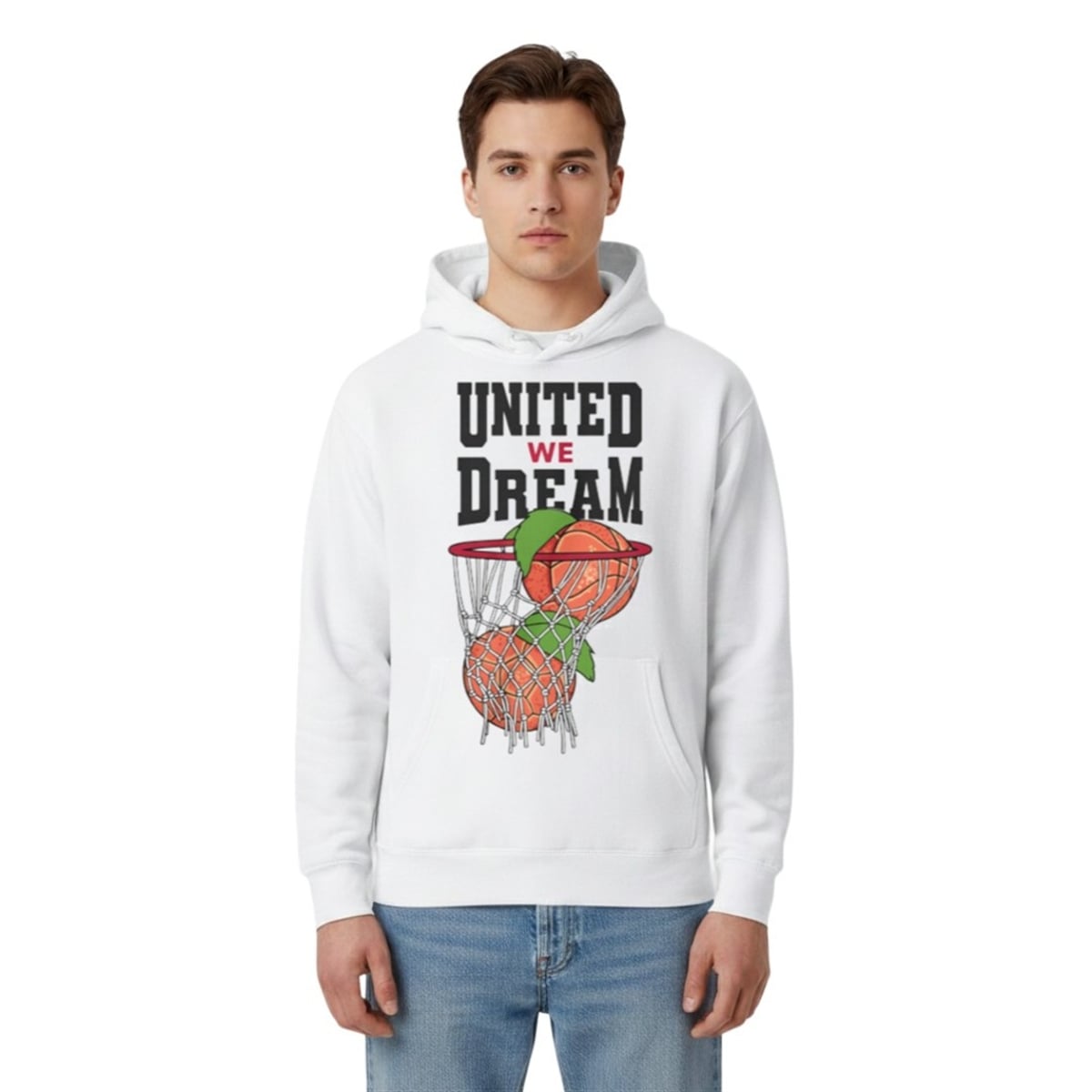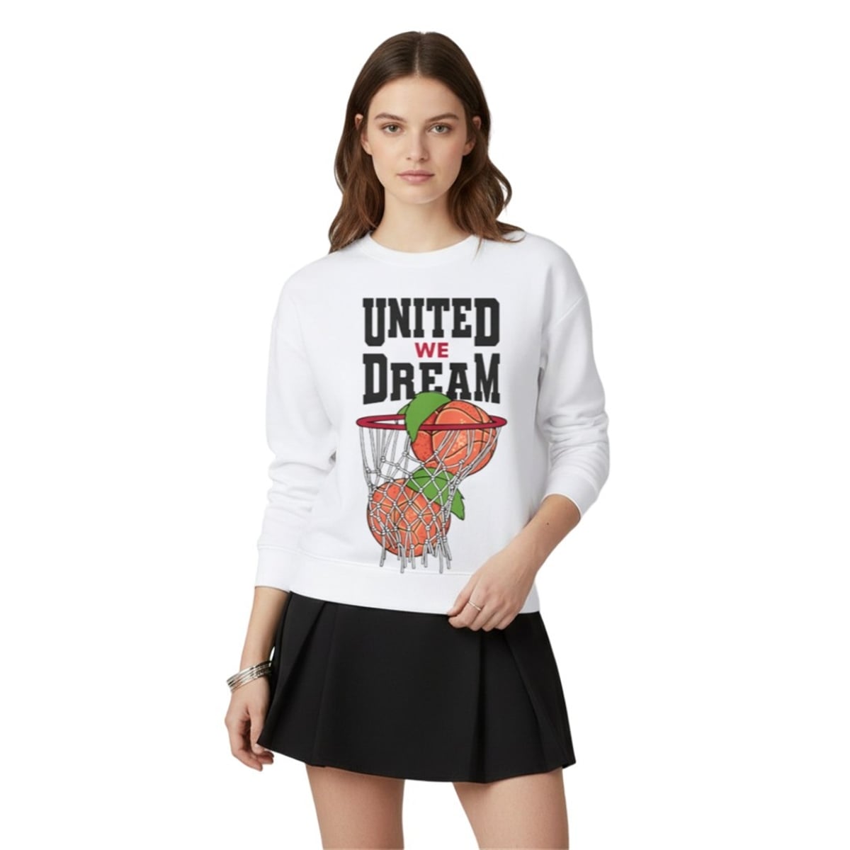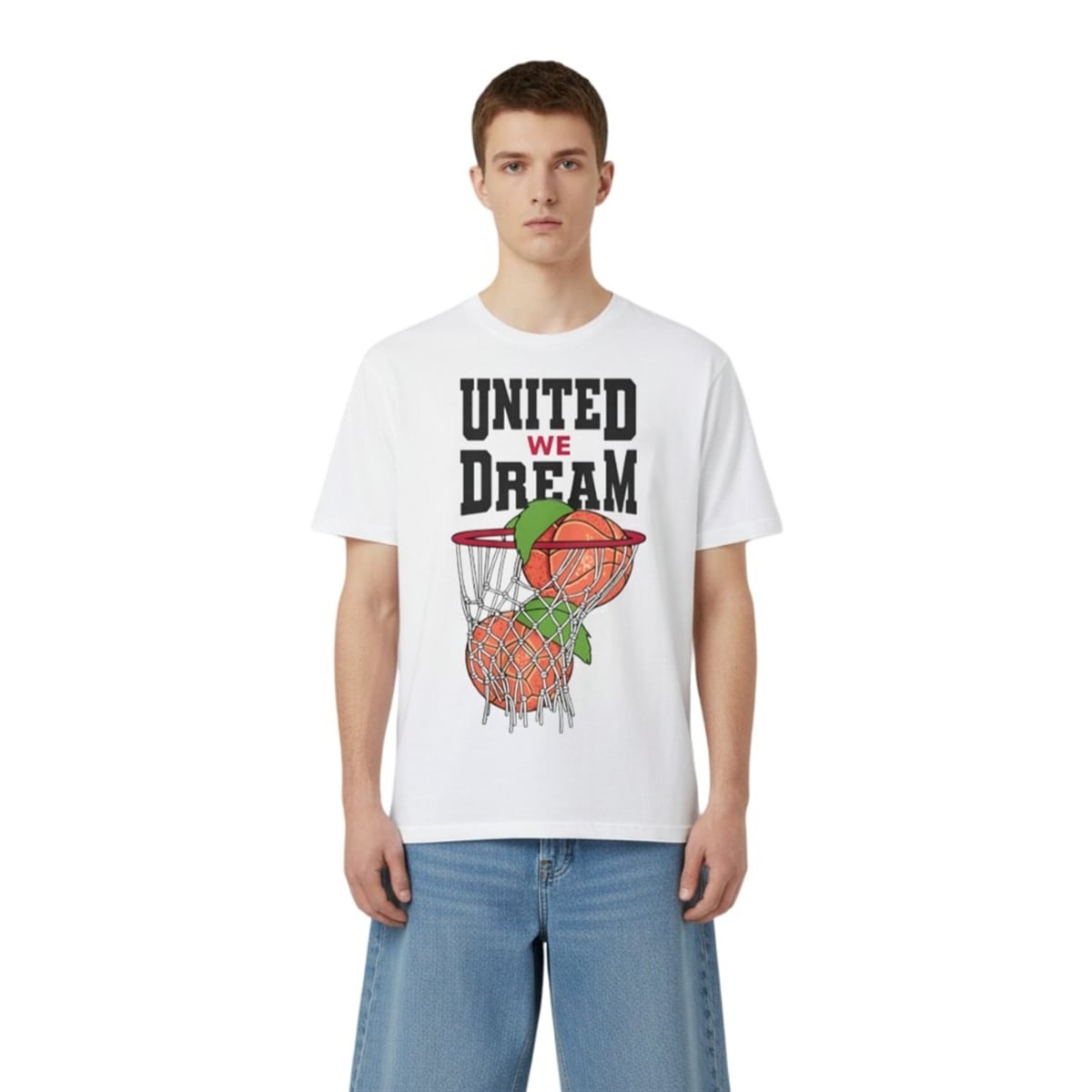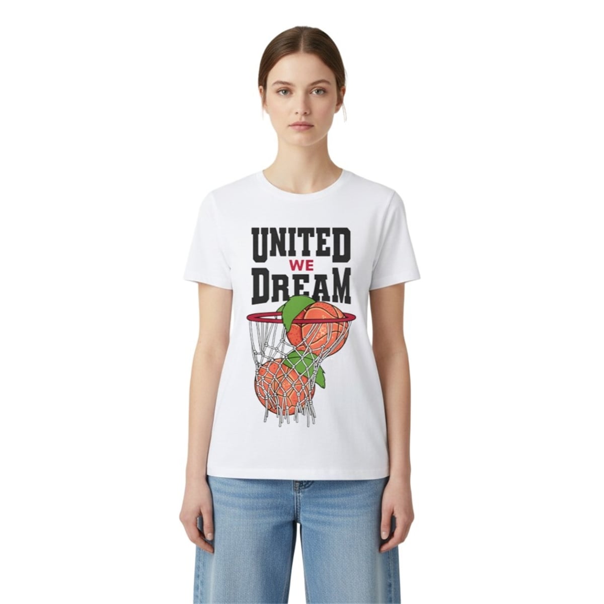 The shirt is far more than just casual apparel; it is a wearable manifesto. The design features a crisp, visually arresting graphic centered around the bold, collegiate-style typography reading “UNITED WE DREAM.” Beneath this empowering slogan sits a highly creative illustration: two basketballs cleverly styled with green leaves—resembling ripening peaches—falling perfectly through a bright red basketball hoop. This unique visual metaphor seamlessly blends the fierce, competitive spirit of the court with themes of natural growth, community, and the sweet reward of achieving hard-fought goals. It is a visually dynamic piece designed specifically to honor the achievements of women while pushing the dialogue of equality forward.