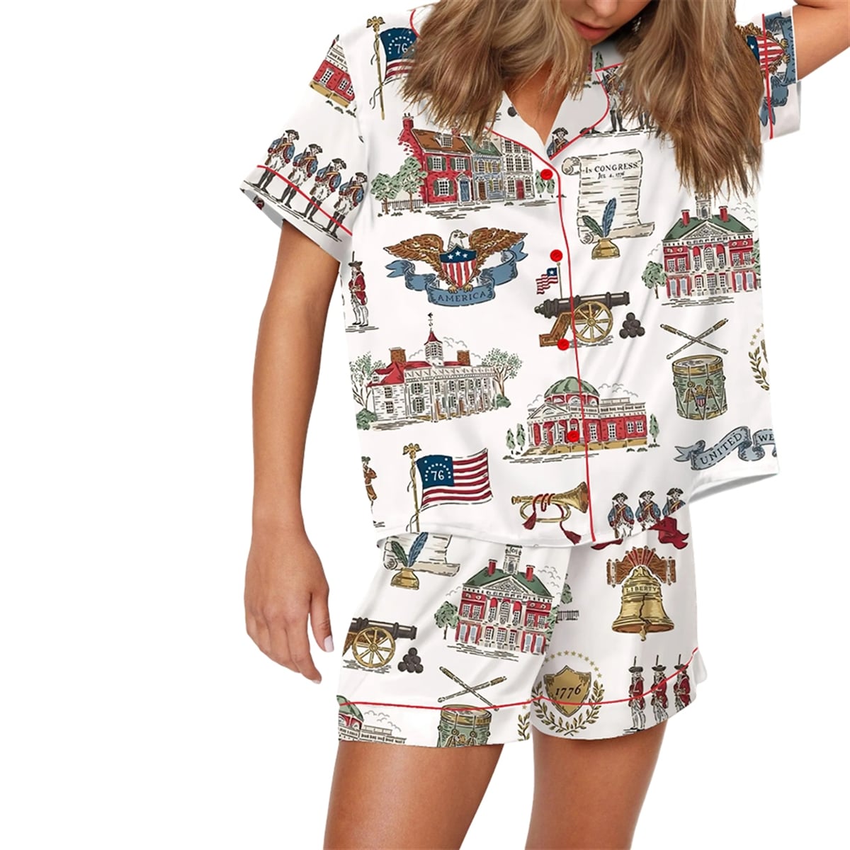 The set is a visually dynamic, two-piece loungewear ensemble featuring a short-sleeved, button-front top and matching shorts. The design utilizes a crisp white background to highlight an intricate, vintage-inspired Americana motif. The detailed, all-over pattern includes striking illustrations of Revolutionary War soldiers, colonial cannons, the iconic “76” flag, bald eagles bearing the banner of “America,” and classic colonial architecture reminiscent of Independence Hall. Distinctive red piping along the collar, placket, and shorts hem frames the historical artwork, while contrasting red buttons complete the cohesive, patriotic aesthetic.