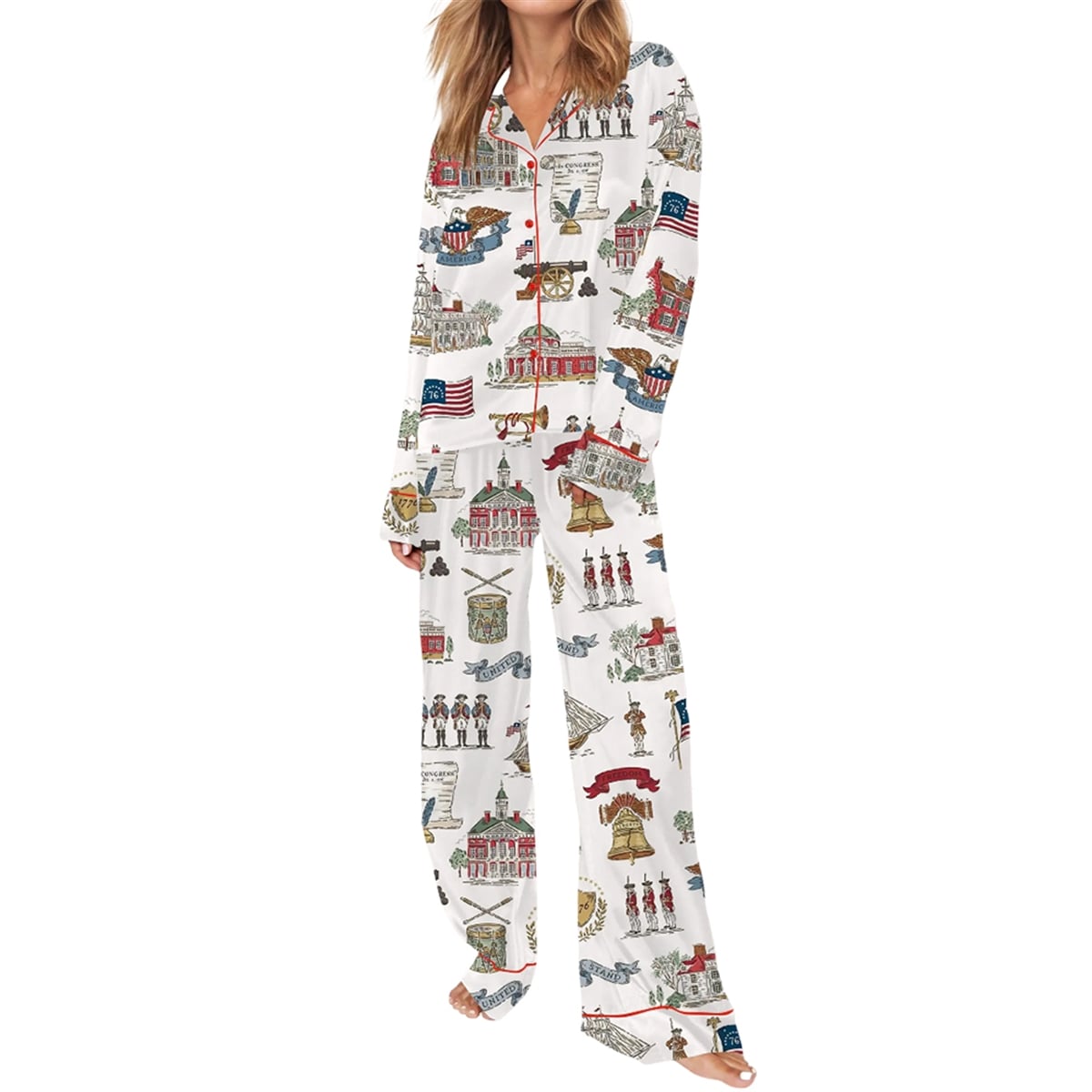 As the United States celebrates its monumental 250th anniversary, commemorating the occasion calls for distinct and highly visual apparel. The USA 250th Pajama Set For Women captures the grand spirit of 1776 through a stunning visual tribute to American independence. Featuring a vibrant, all-over novelty print of foundational historical symbols, this set offers a unique way to display national pride during the historic 2026 celebrations.