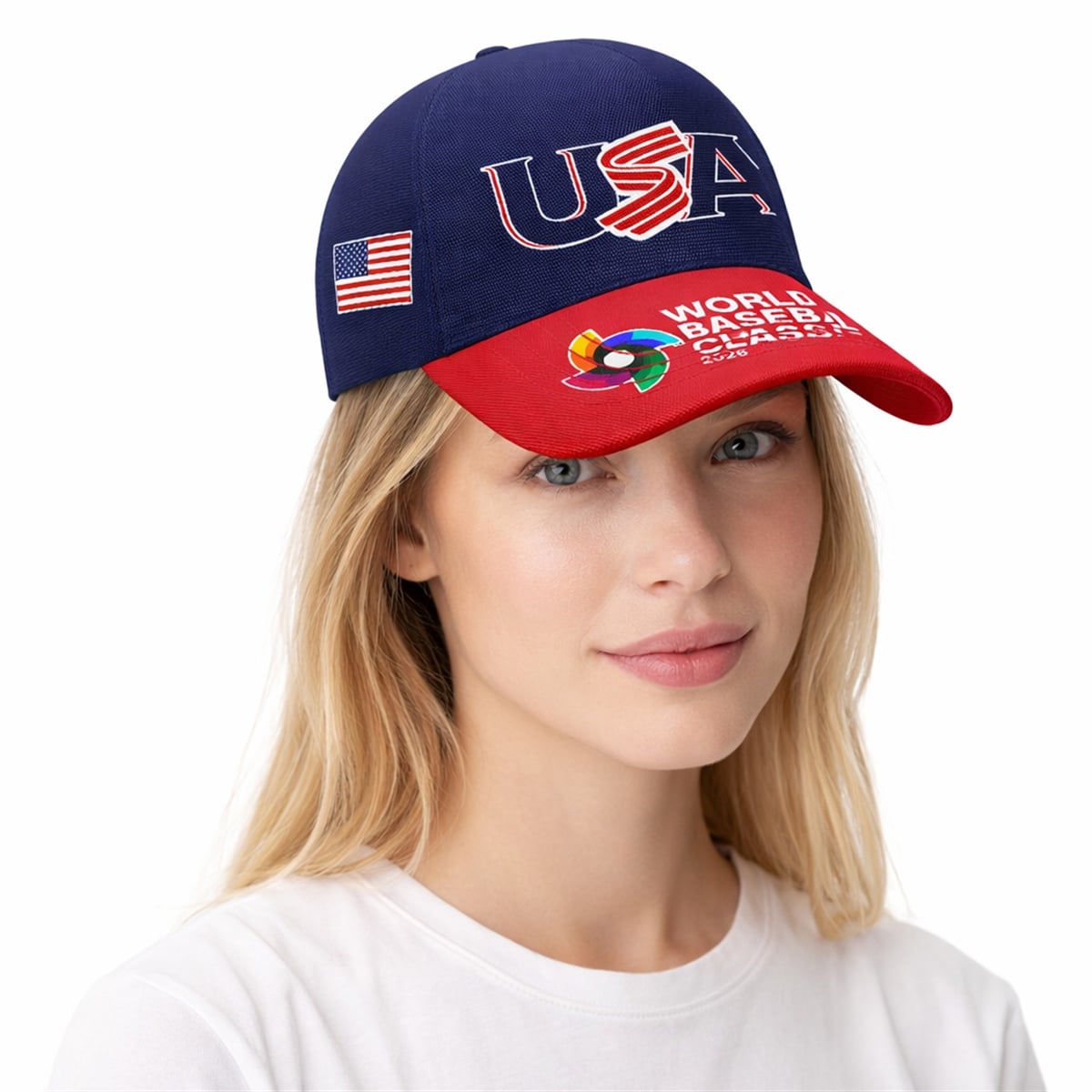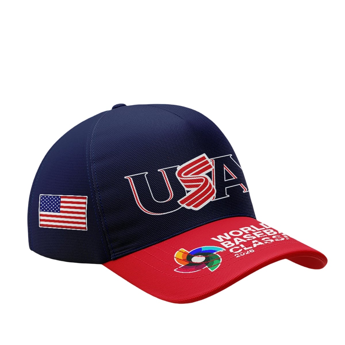 The side profile is accented with a classic American flag patch, cementing its patriotic identity. Furthermore, the visor acts as a commemorative canvas, proudly displaying the “World Baseball Classic 2026” text alongside the tournament’s colorful, globally recognized pinwheel logo. This visually striking piece of merchandise allows fans to carry the spirit of the tournament with them long after the final pitch is thrown.