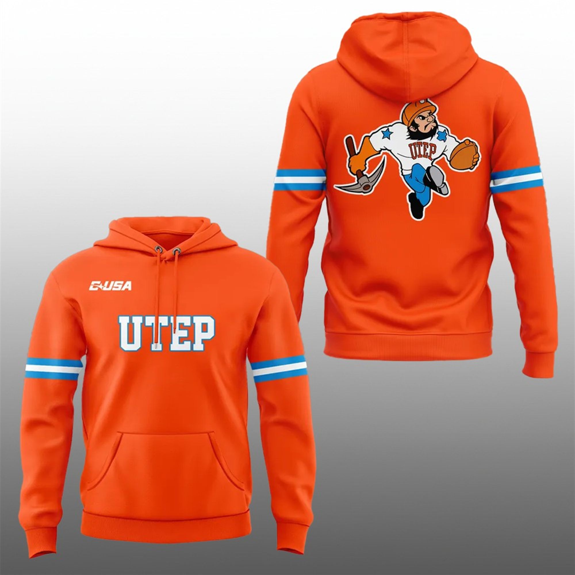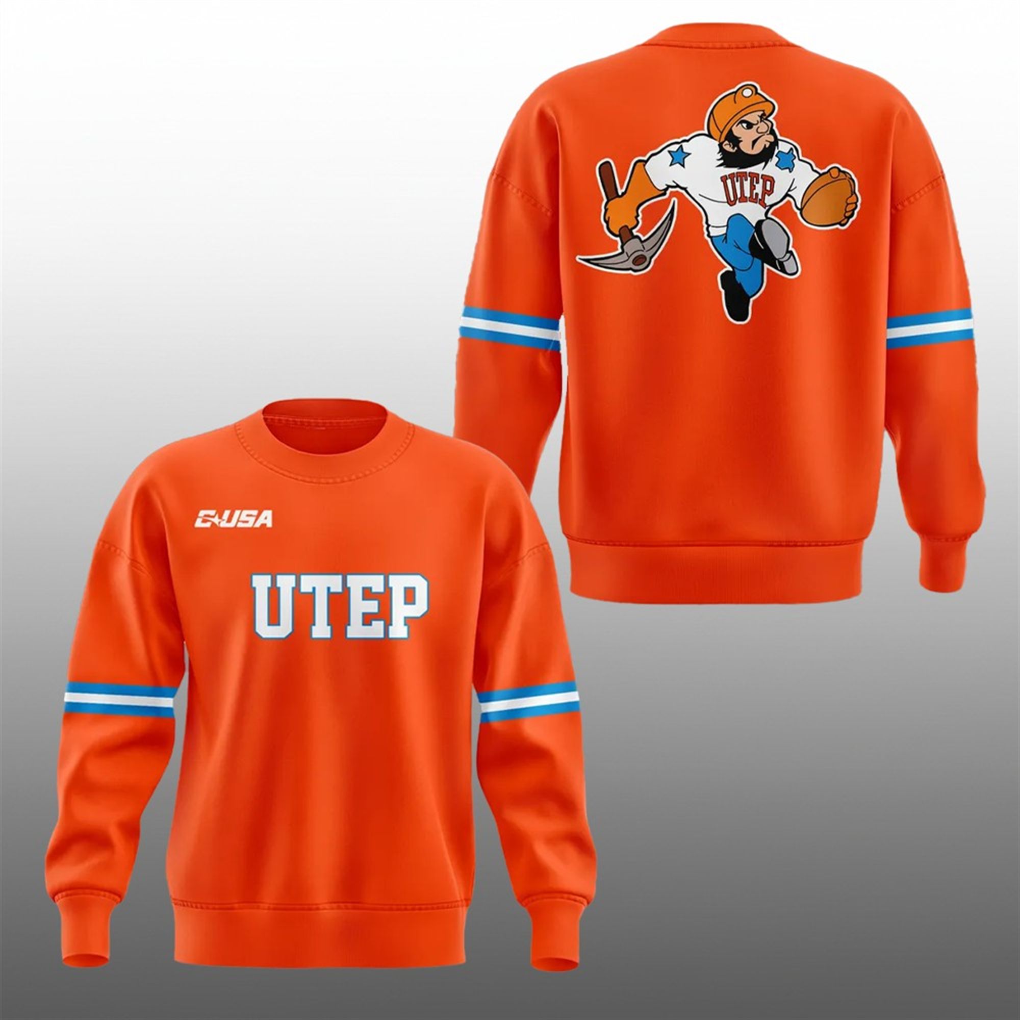 The front of the shirt features bold, varsity-style “UTEP” lettering in white with a sharp blue outline, projecting a clean and classic collegiate look. Notably, the inclusion of the C-USA (Conference USA) logo on the upper chest adds an authentic touch, making it feel like official sideline gear. The sleeves are accented with dual stripes in white and blue, mimicking the aesthetic of a vintage football jersey while maintaining the comfort of a casual t-shirt.