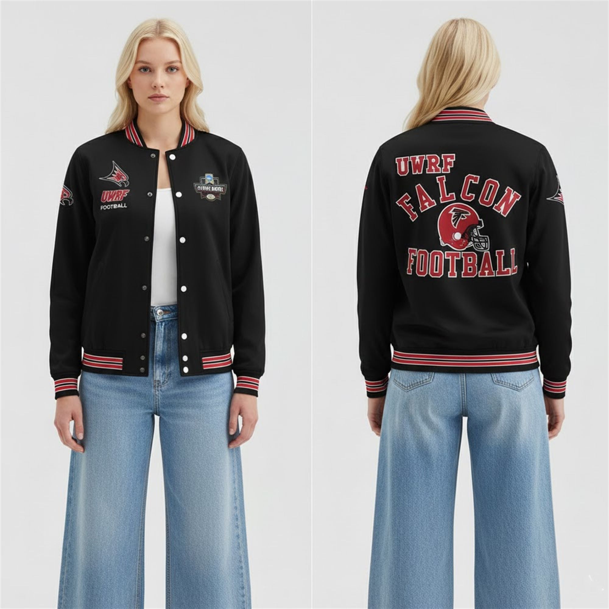 On the back, the jacket makes a massive statement with oversized “UWRF Falcon Football” lettering and the iconic helmet graphic, ensuring your fandom is visible from every angle. This item is designed for versatility, easily transitioning from victory parades to casual campus wear or alumni gatherings. It is a piece of history, capturing the exact moment the Falcons conquered the national bracket.