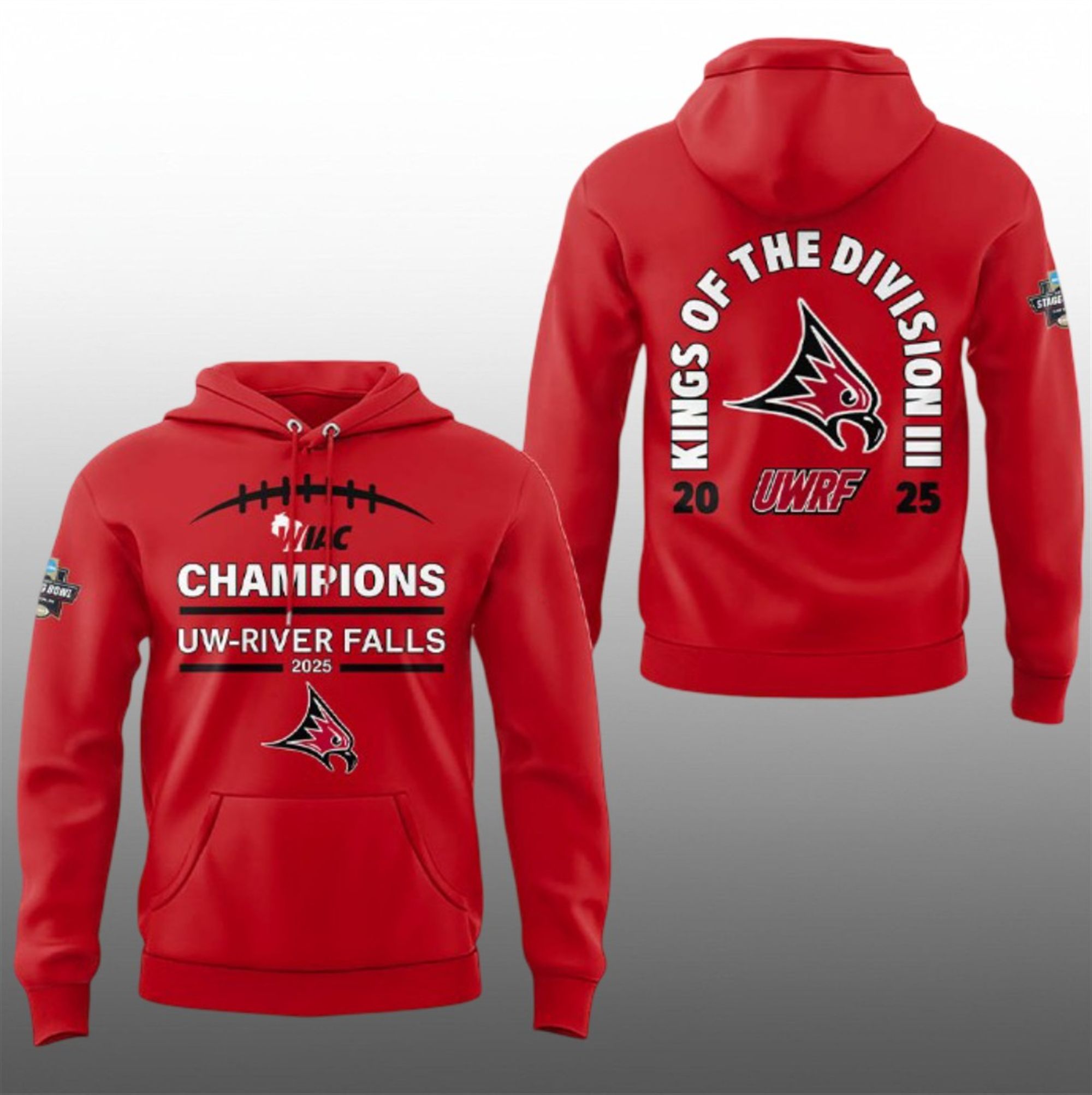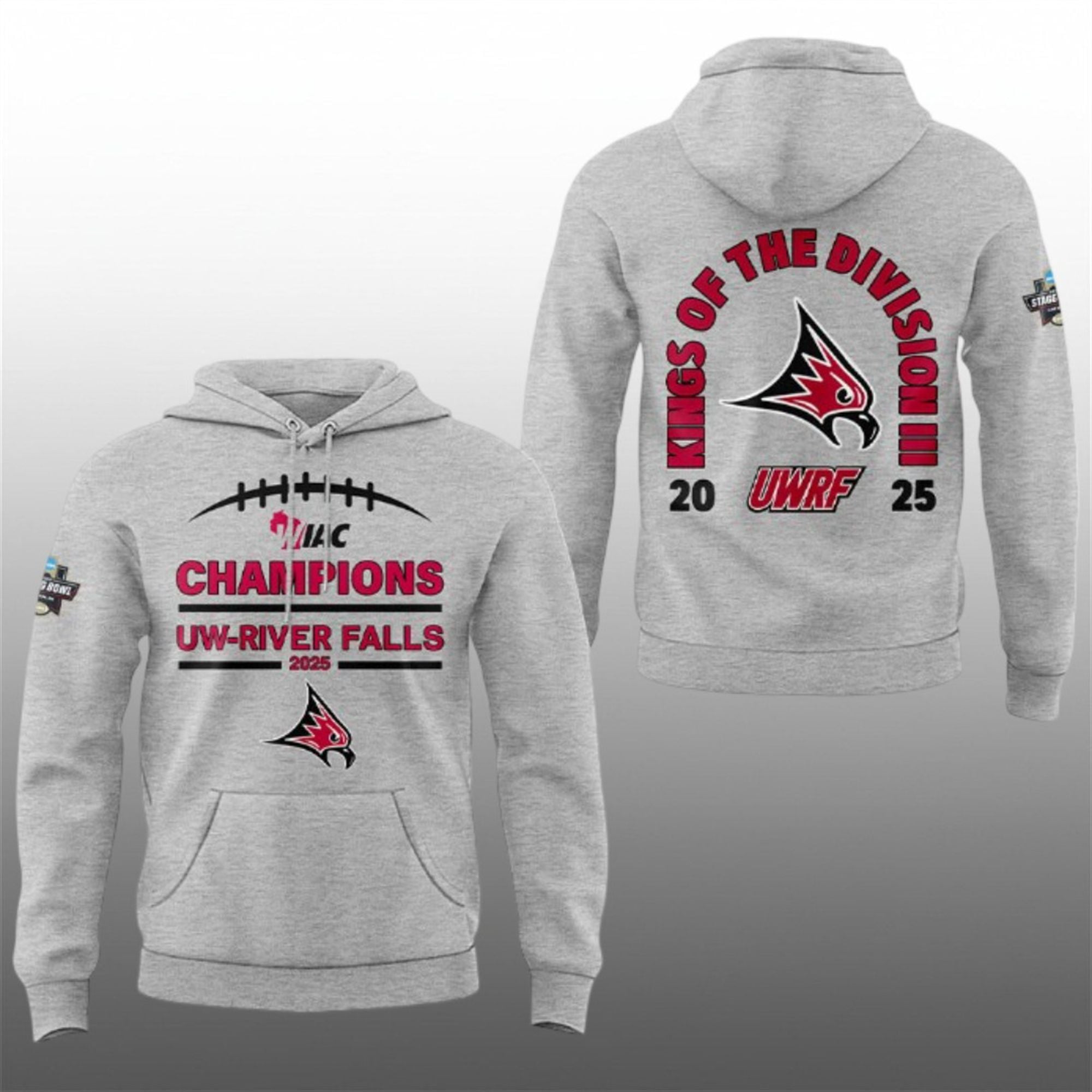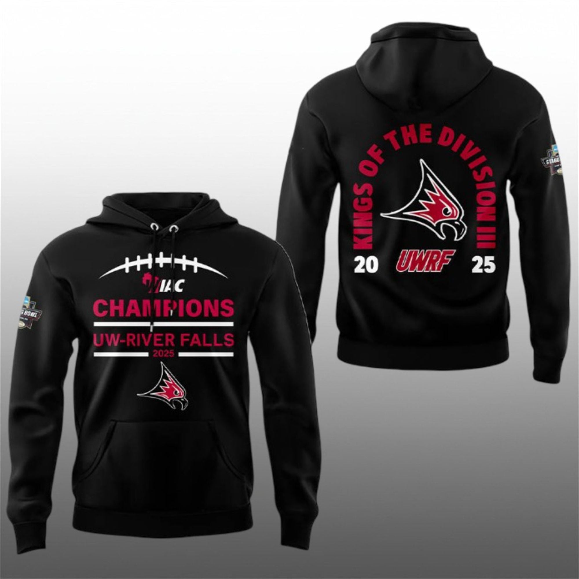 The hoodie is more than just merchandise; it is a wearable piece of history. This bold, double-sided design encapsulates the Falcons’ miraculous journey to the pinnacle of college football. The front proudly displays the “WIAC CHAMPIONS” insignia, honoring the team’s grueling run through the toughest conference in Division III. The back features the aggressive “KINGS OF THE DIVISION III” graphic, a nod to the Falcons’ newly minted status as National Champions following their stunning Stagg Bowl victory.