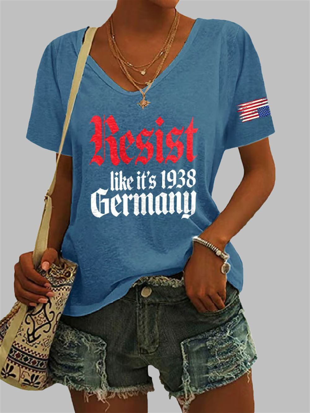 V-neck Resist Like It’s 1938 Germany Print T-Shirt – Make a Powerful Statement