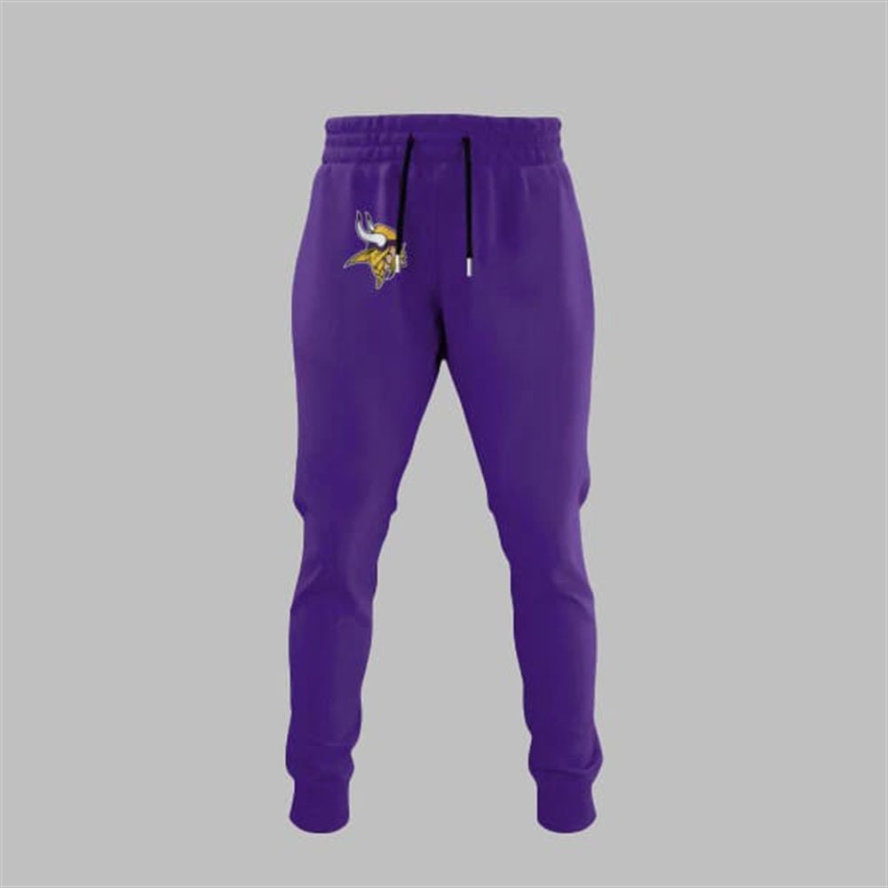 The front of this vibrant, classic-purple tee makes a bold statement. The iconic “Vikings” wordmark is prominently displayed in a striking white script, underlined by a sleek silver line that culminates in a battle axe—a nod to the team’s fierce heritage. Just below, the legendary Vikings Norseman logo stands ready, representing decades of football history and passion.