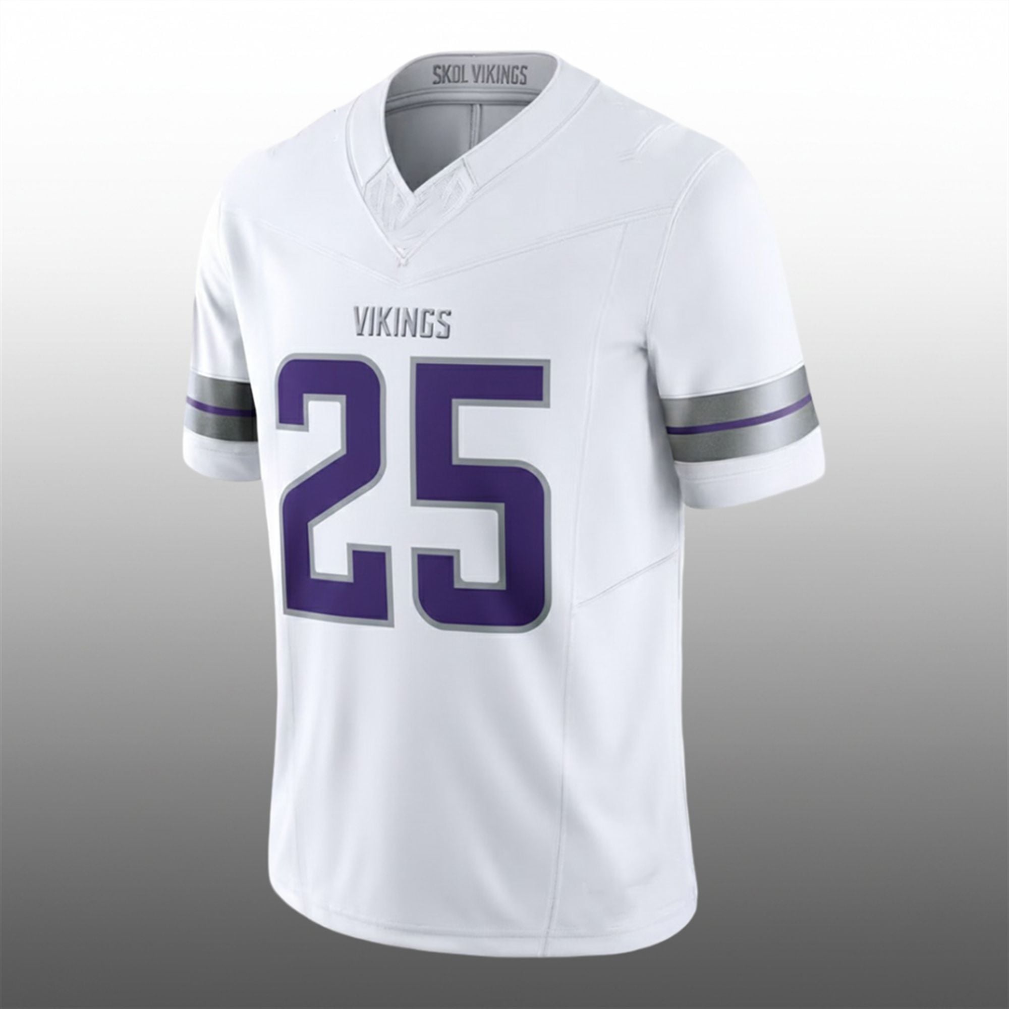 The number 25 on this jersey is no coincidence. It perfectly commemorates the massive Christmas Day (Dec. 25, 2025) showdown against the Detroit Lions, where the Vikings debuted their full “Winter Warrior” aesthetic in a prime-time slot. This jersey mimics that clean, icy look that dominated the field.