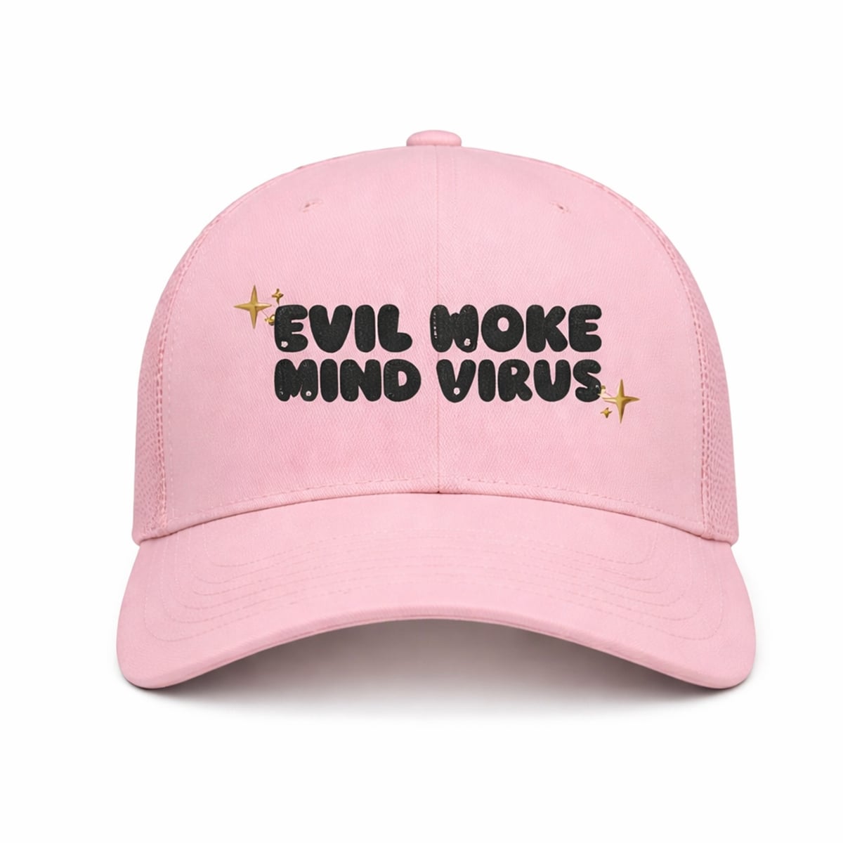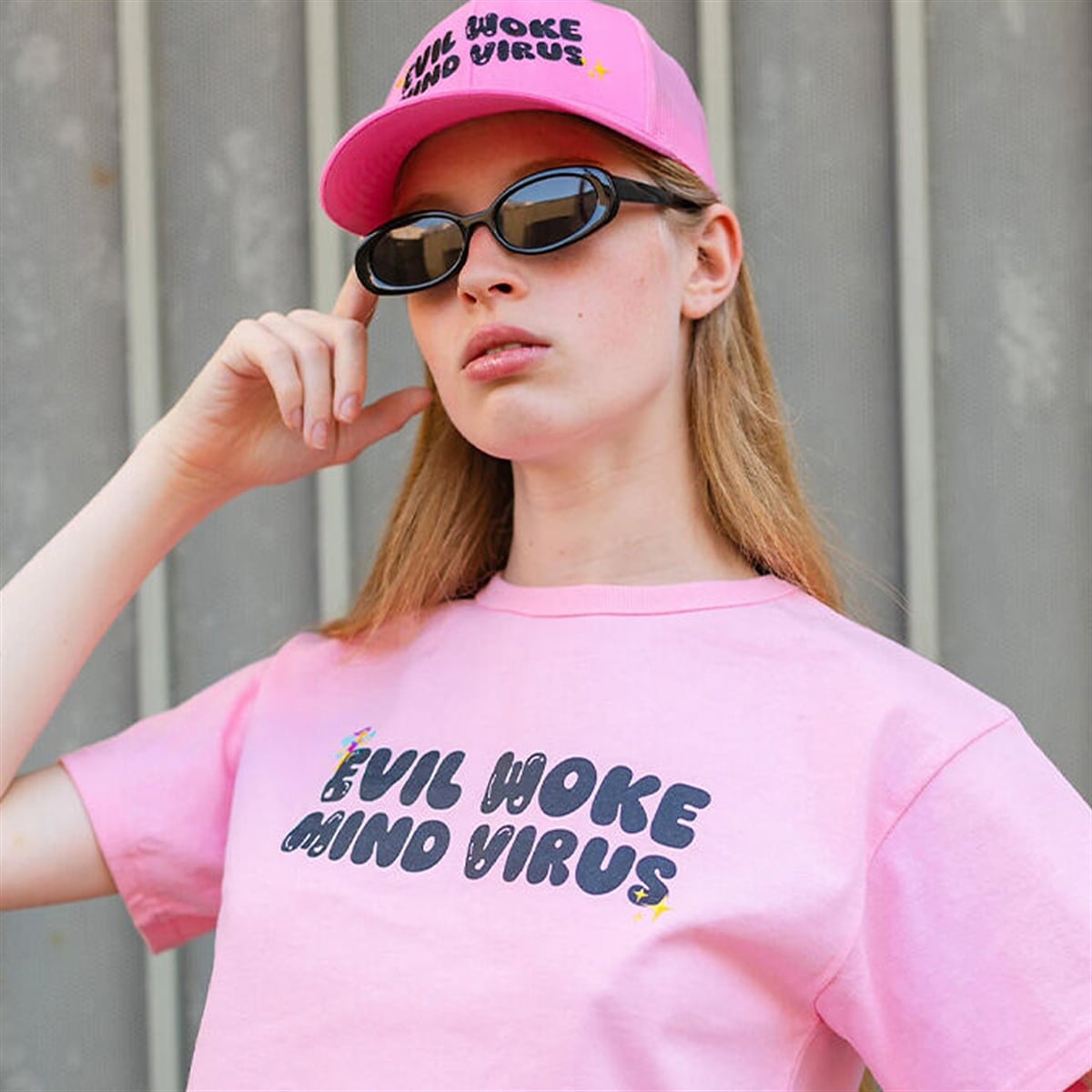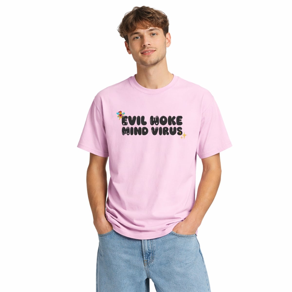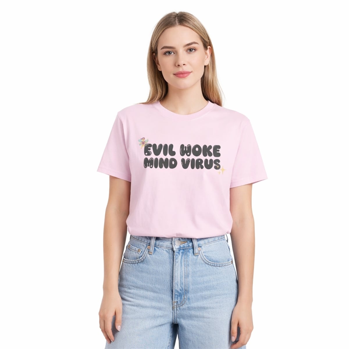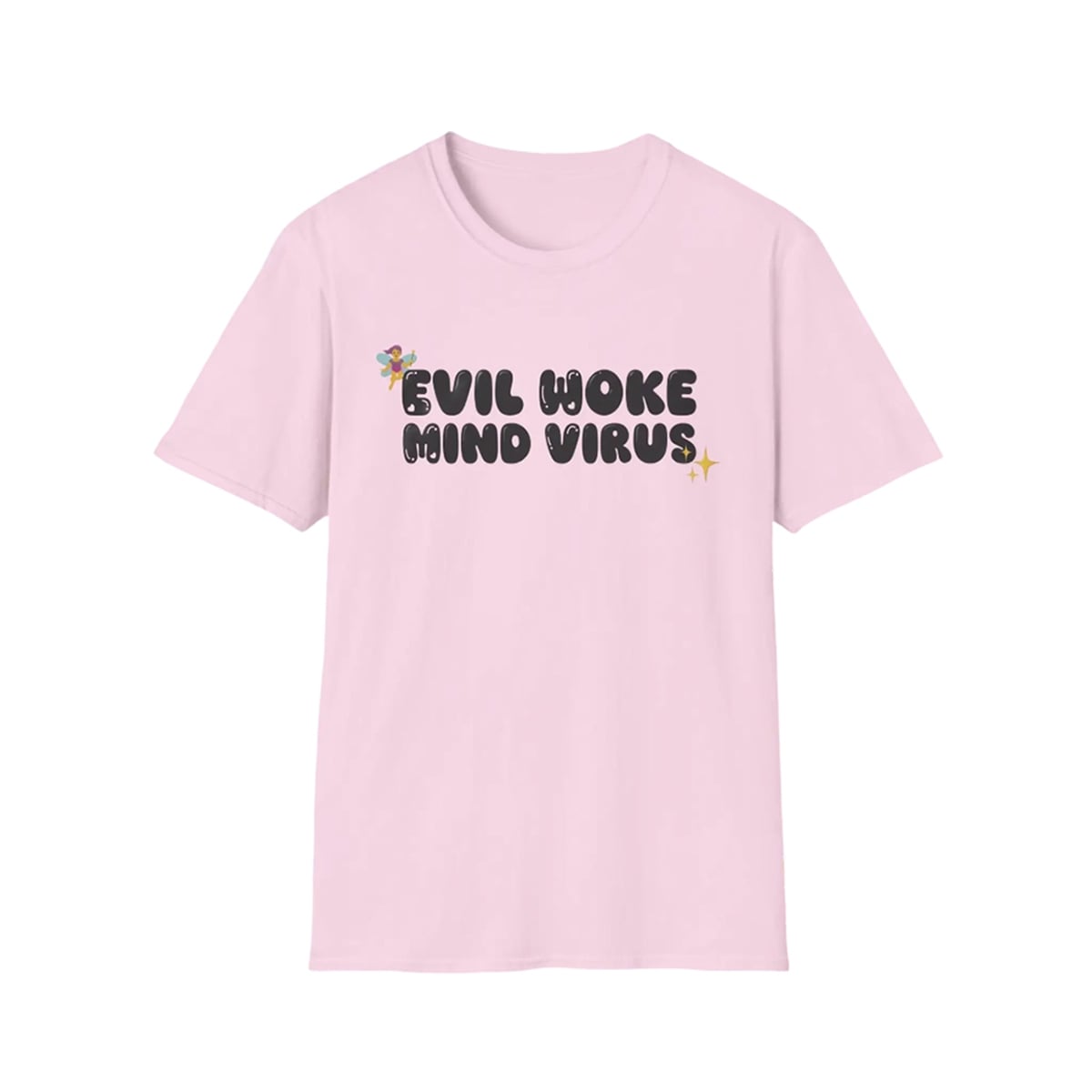 In the world of statement fashion, few designs manage to capture a complex cultural moment as perfectly as the shirt. This striking pink top relies entirely on the brilliance of juxtaposition. Across the chest, the phrase “EVIL WOKE MIND VIRUS” is rendered in a bubbly, exaggerated, and almost cartoonish black font. To further the irony, the heavy, controversial text is adorned with whimsical, hyper-feminine graphics, including a tiny, delicate fairy and twinkling yellow starbursts. It is a brilliant collision of intense sociopolitical rhetoric and lighthearted, nostalgic Y2K design, making it an instantly recognizable piece of modern internet history.