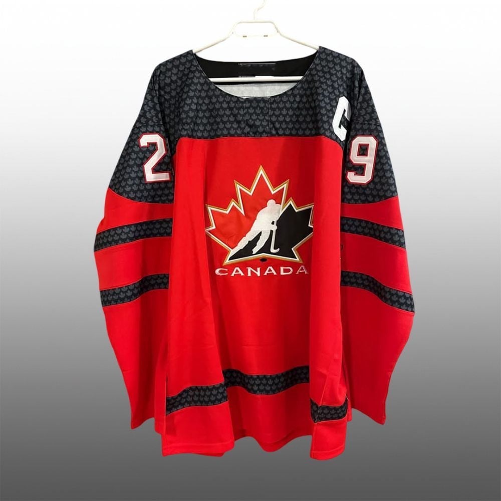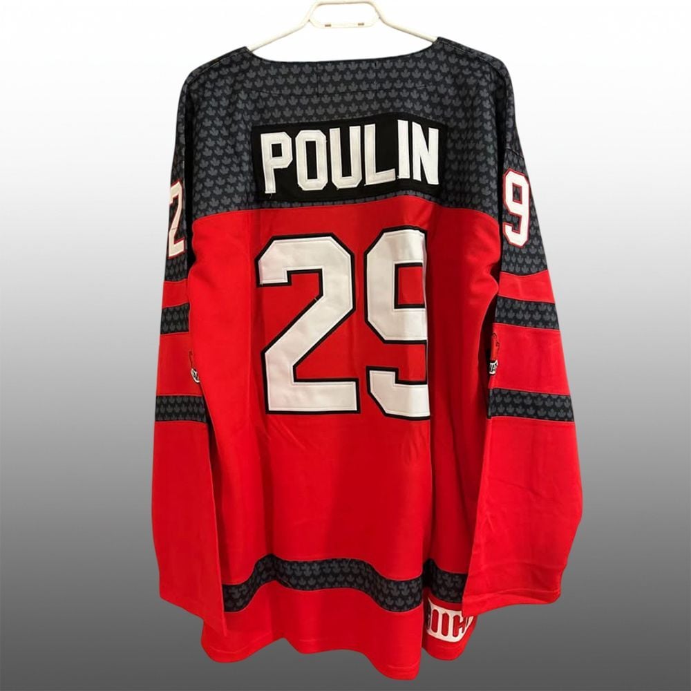 Iconic Team Canada Design: Features the classic, bold red, black, and white colorway with the striking, multi-layered Team Canada maple leaf crest stitched proudly on the chest. “POULIN 29” Customization: High-quality, pro-style twill name and numbers are meticulously onto the back and sleeves, celebrating the legacy of “Captain Clutch.”