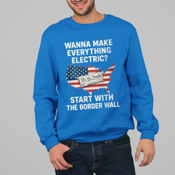 The Wanna Make Everything Electric Start With The Border Wall Shirt is more than just clothing; it’s a bold declaration. Combining a provocative message with iconic American symbols and quality construction, it’s designed for those who aren’t afraid to express their views and engage in political discourse. If you believe in prioritizing border security or want apparel that makes people think and talk, this shirt delivers. Add this impactful and conversation-starting tee to your collection today.