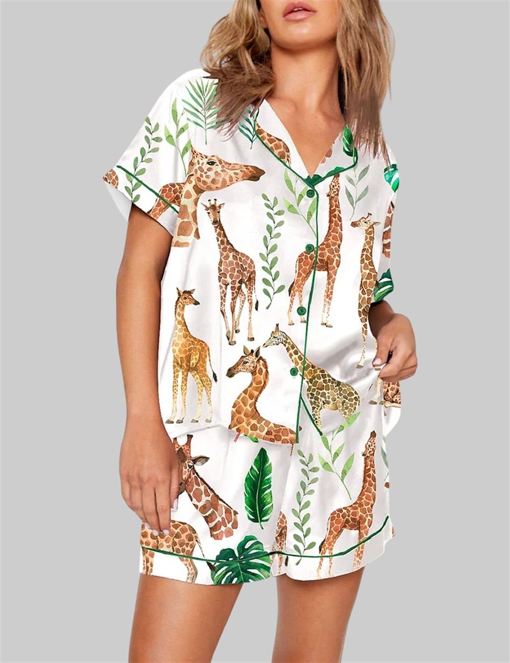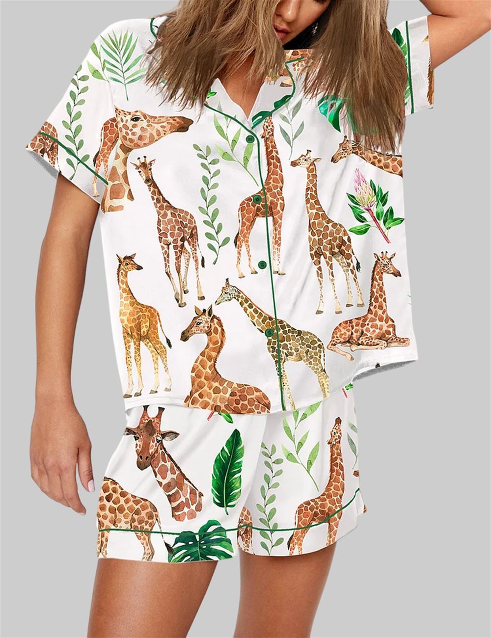 Welcome to your personal safari of serenity with our Watercolor Giraffe Pajama Set. This isn’t just sleepwear; it’s an experience. Each set features a beautifully rendered design of graceful giraffes, brought to life with the soft, ethereal strokes of a watercolor painting. Set against a crisp white background, these majestic creatures are interspersed with lush, green botanical leaves, creating a vibrant yet soothing pattern. The entire ensemble is framed with elegant dark green piping on the collar, cuffs, and hem, adding a touch of classic, tailored sophistication to this whimsical design.