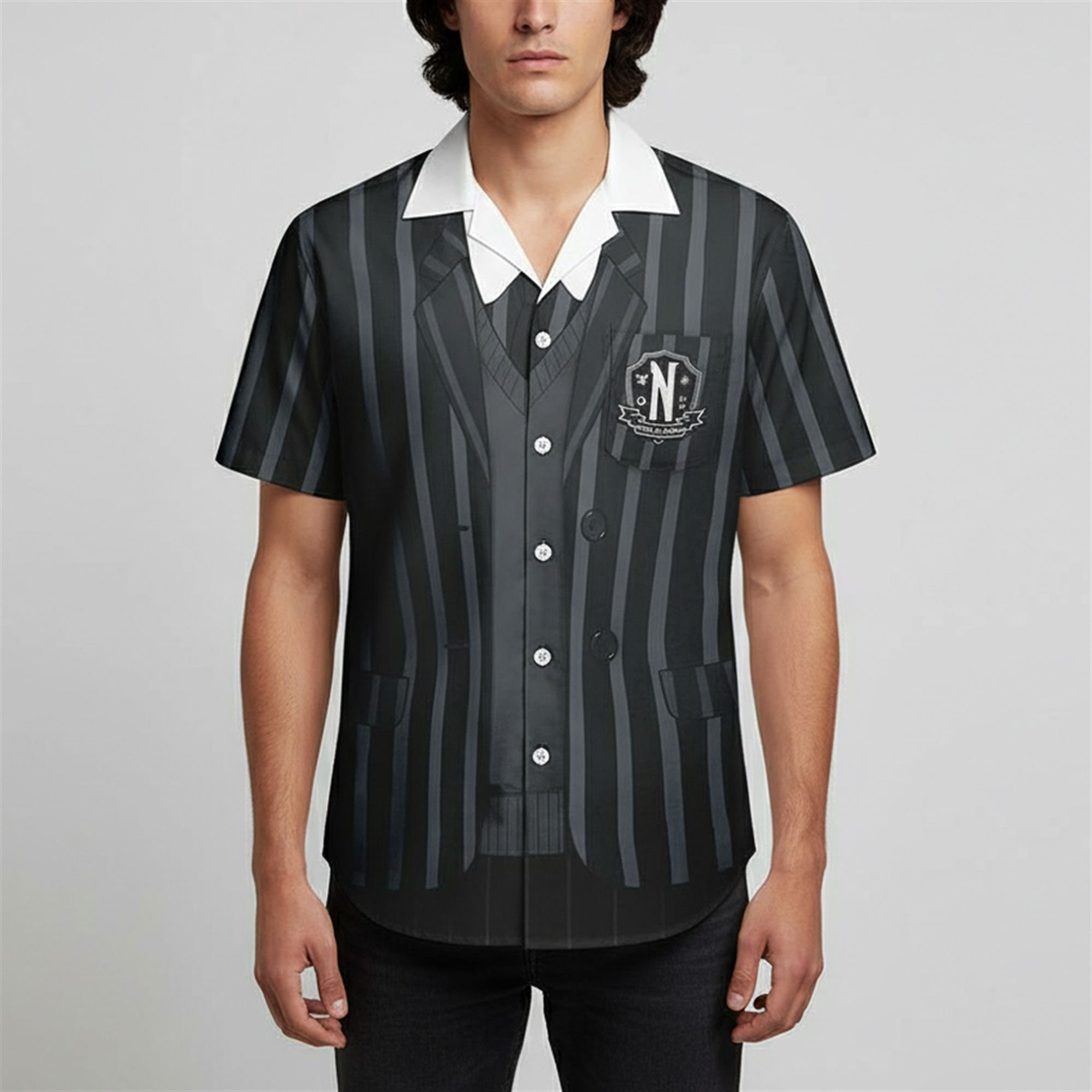 We’ve perfectly captured the visual essence of the Nevermore Academy uniform. The shirt features a deep black base accented with sharp, clean white pinstripes, creating a look that is both striking and sophisticated. The crisp white collar provides a stark, eye-catching contrast, while the Nevermore “N” crest on the chest pocket adds that crucial touch of authenticity. Unlike a rigid, traditional uniform, this piece is designed in a relaxed Hawaiian shirt style, offering a breathable, lightweight fit that ensures you can comfortably investigate mysteries or master the dance floor all night long.