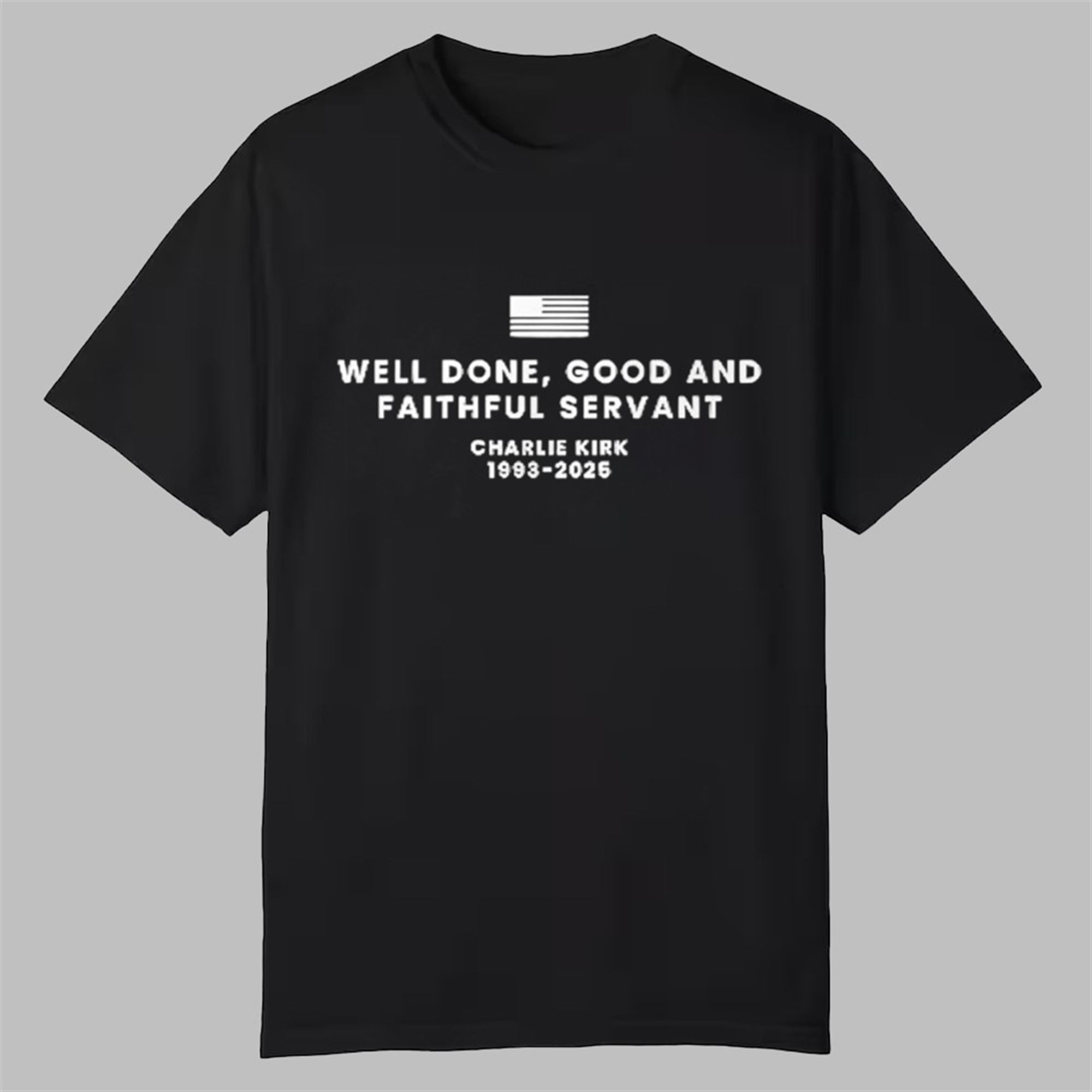 The central message, “WELL DONE, GOOD AND FAITHFUL SERVANT,” is a direct reference to the Parable of the Talents (Matthew 25:23). This deeply meaningful biblical verse is a final commendation, celebrating a life lived with purpose, faith, and unwavering service. Below this, the shirt respectfully displays his name and the years of his life, “CHARLIE KIRK 1993-2025,” marking the profound impact he made in just 31 years.