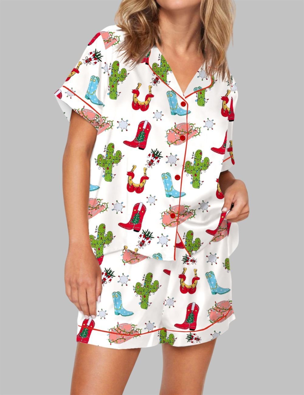 Our pajama set features a vibrant and whimsical all-over print that beautifully merges classic holiday elements with iconic western motifs. You’ll find cheerful green cacti adorned with colorful Christmas lights, bright red and blue cowboy boots ready to be filled with treats, and glittering sheriff’s badges that add a touch of sparkle. This playful design is set against a clean white background, allowing the festive colors to pop. The classic two-piece set includes a short-sleeve, button-down top with a notched collar and stylish red piping, paired with matching shorts that offer a relaxed and comfortable fit. It’s the perfect uniform for decorating the tree, sipping hot cocoa by the fire, or opening presents on Christmas morning.