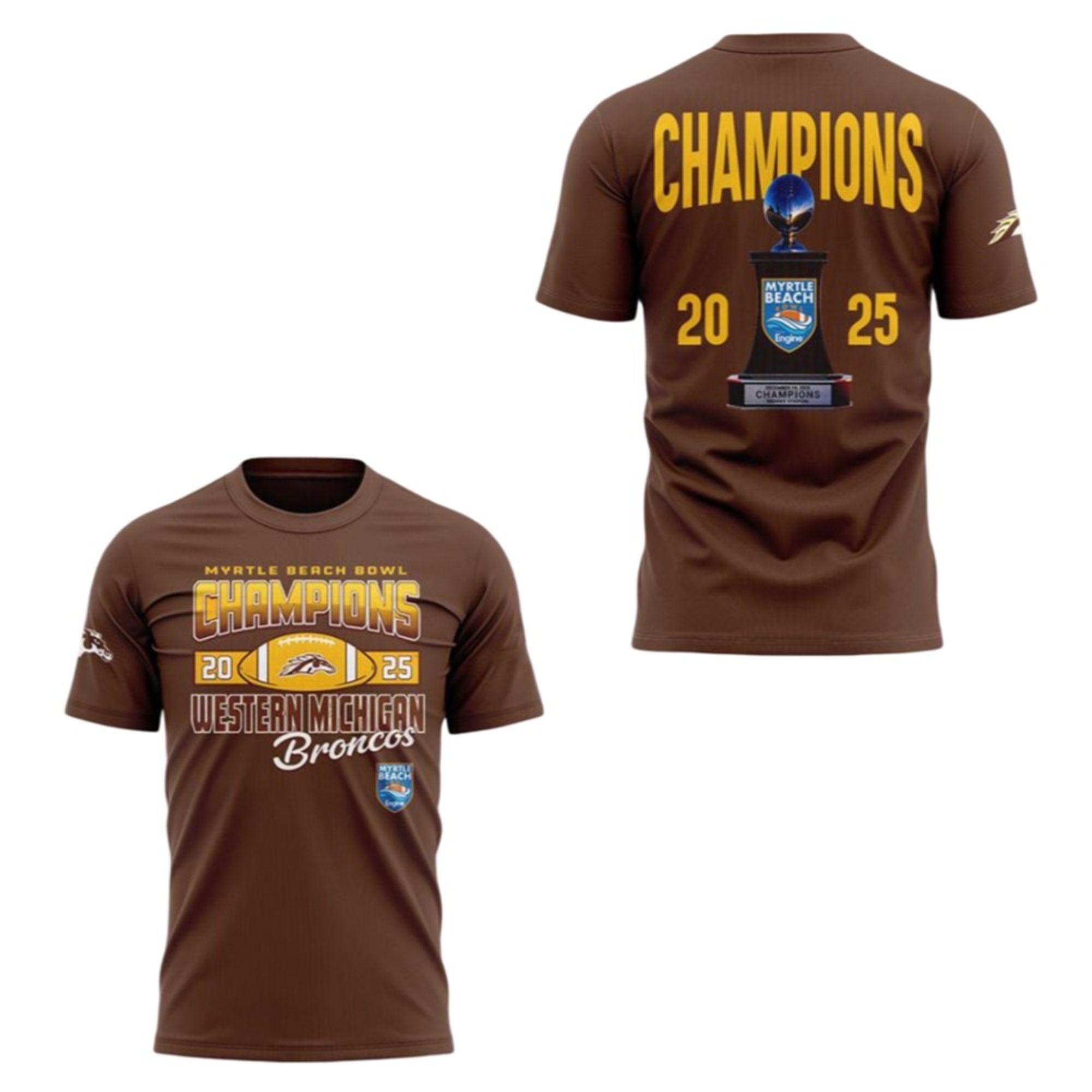 Visually, the shirt utilizes the classic, deep Broncos Brown base, ensuring it matches perfectly with your existing game-day gear. The front design is dynamic and bold, featuring the text “Champions 2025” in striking gold and white typography that pops against the dark background. Central to the design is the Western Michigan Broncos logo, flanked by football iconography and the Myrtle Beach Bowl text.