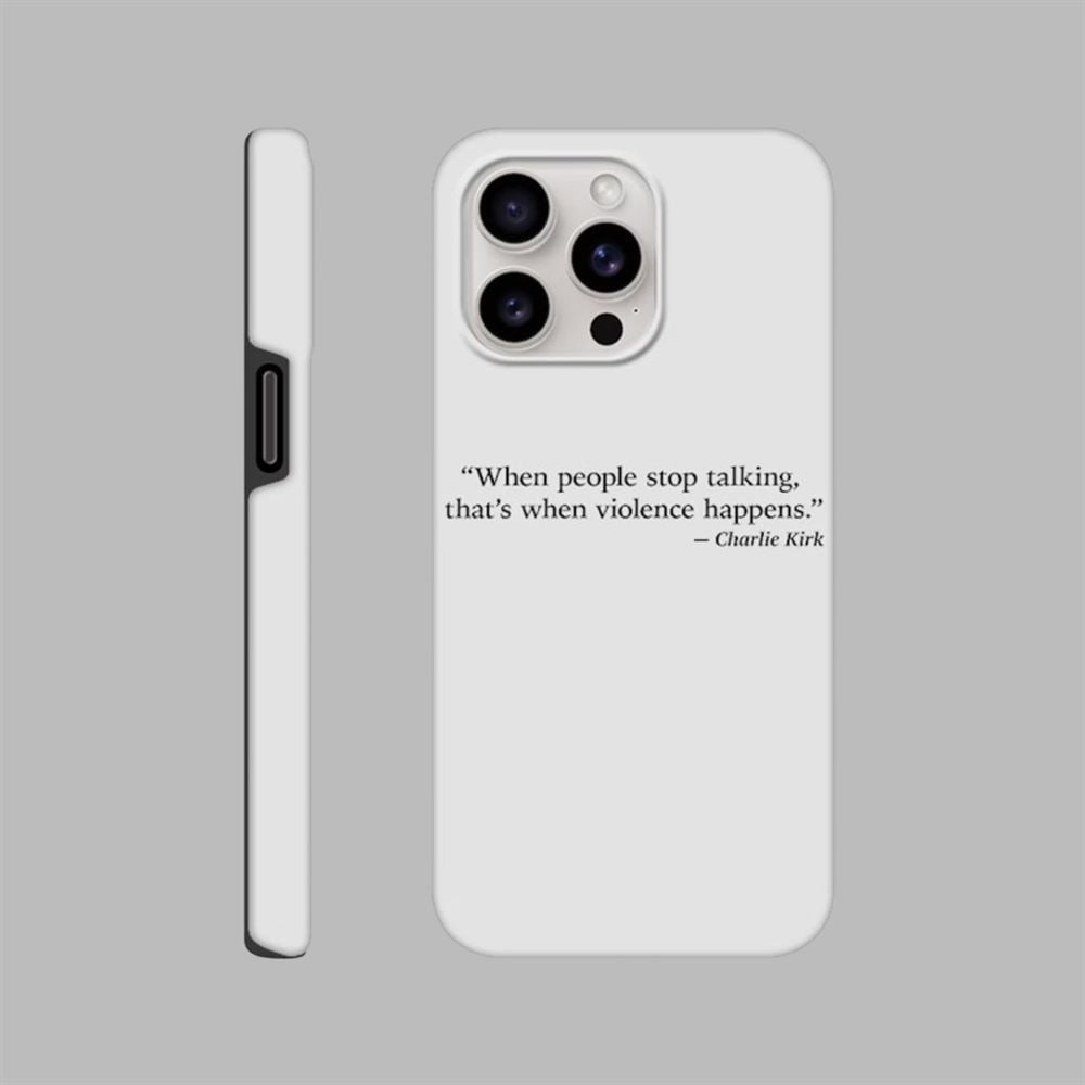 The quote, “When people stop talking, that’s when violence happens,” is a powerful warning and a call to action. It speaks directly to the current cultural moment, urging a return to reason, debate, and mutual understanding. This phone case is for the student active in their Turning Point USA chapter, the politically engaged professional who isn’t afraid to stand for their beliefs, and the everyday American who is concerned about the direction of public discourse. By choosing this case, you align yourself with a movement dedicated to preserving the intellectual and political freedoms that have defined the nation. It’s a way to show your support for leaders like Charlie Kirk who are on the front lines, fighting to ensure all voices can be heard.