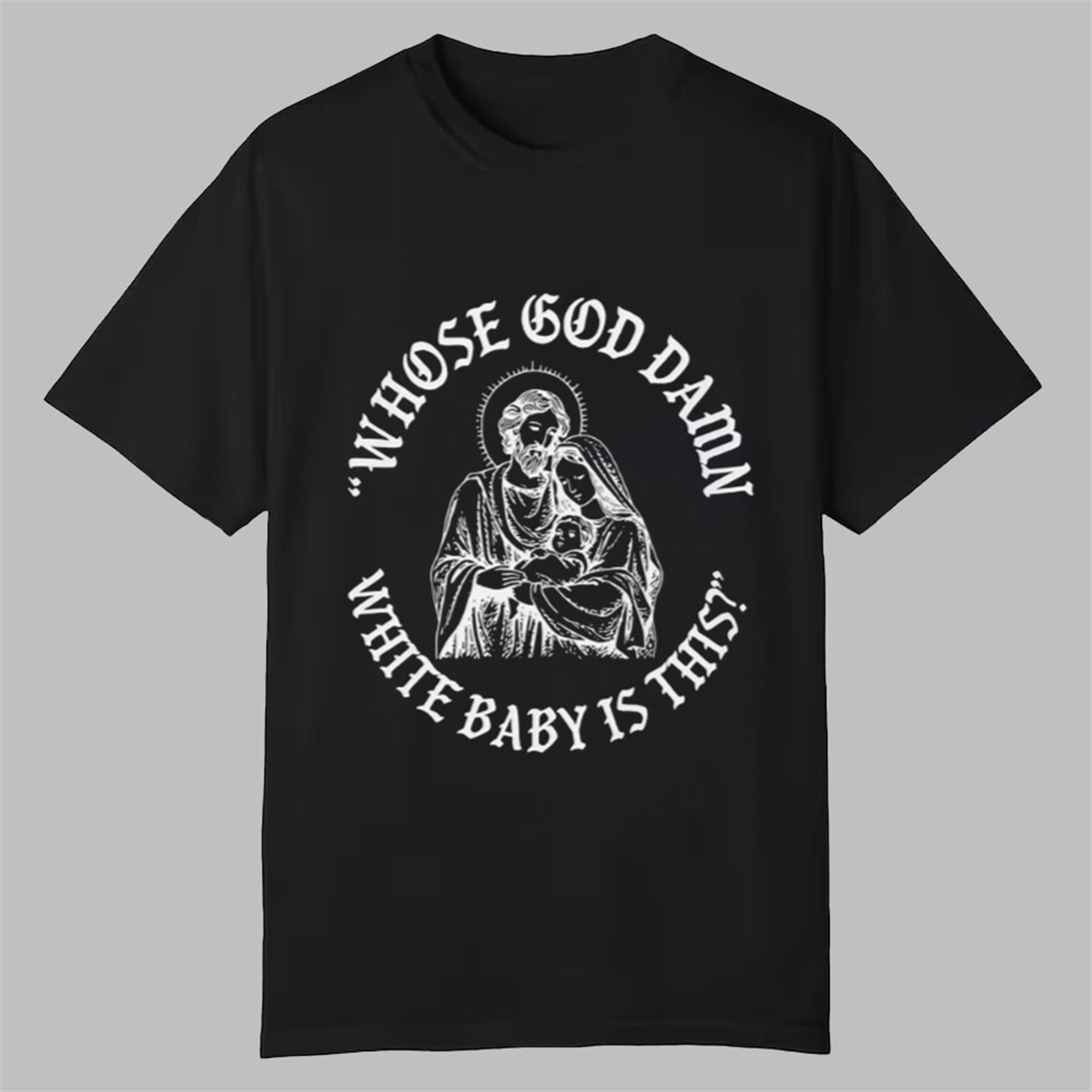 The power of this shirt lies in its brilliant contrast. The design features a beautifully detailed, monochromatic illustration depicting the Holy Family (Joseph, Mary, and baby Jesus) in a style reminiscent of Renaissance art. This traditional, pious imagery is encircled by the bold, provocative text: “Whose God Damn White Baby Is This?”