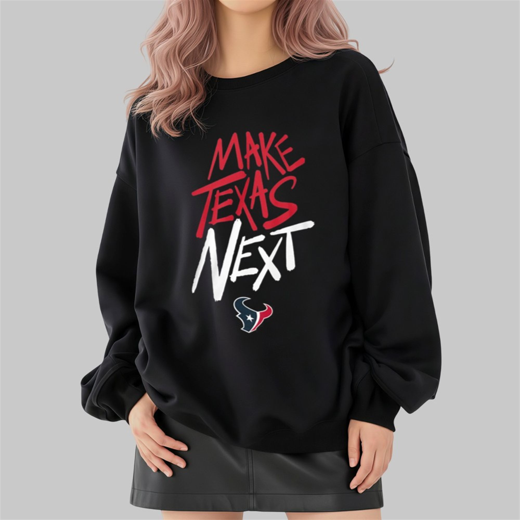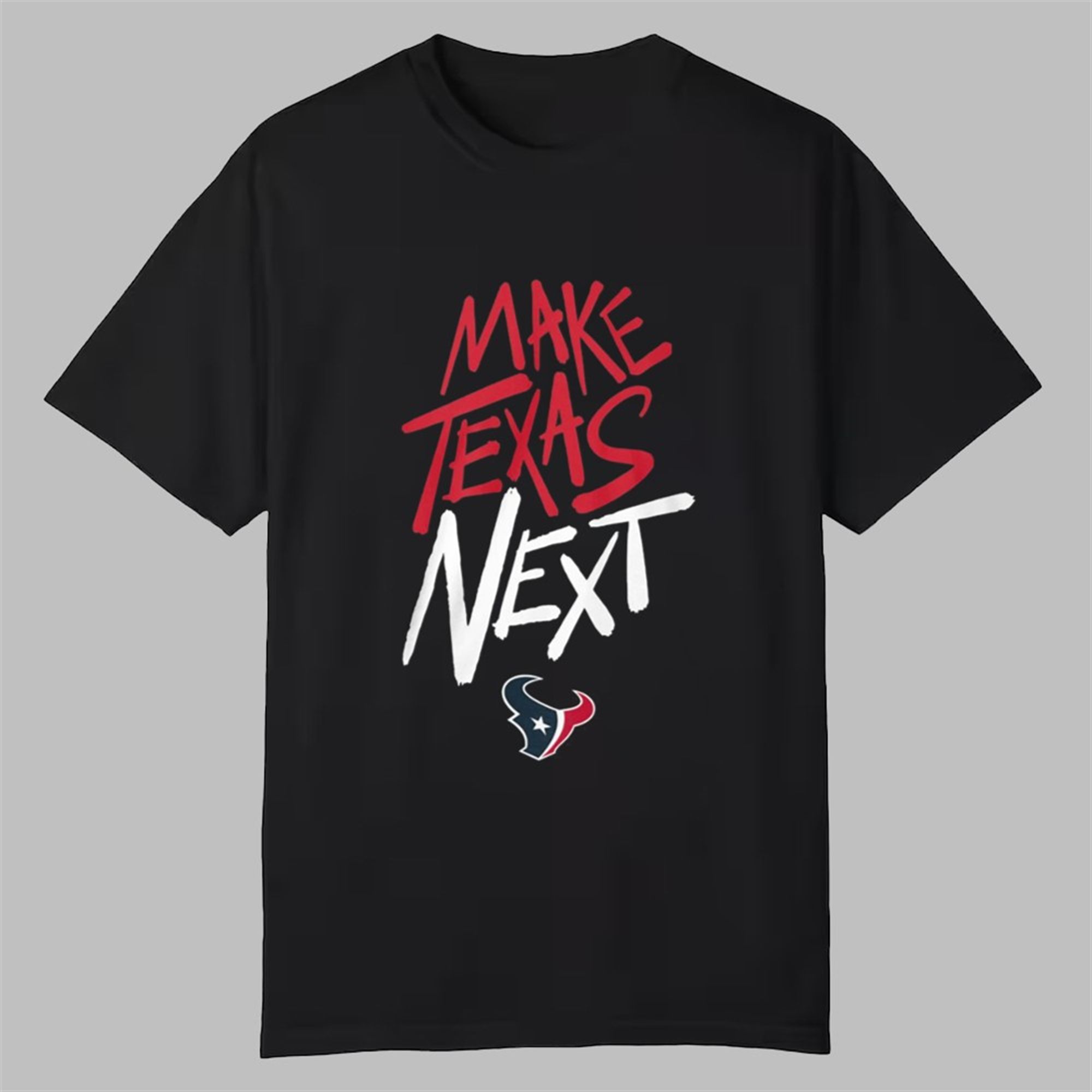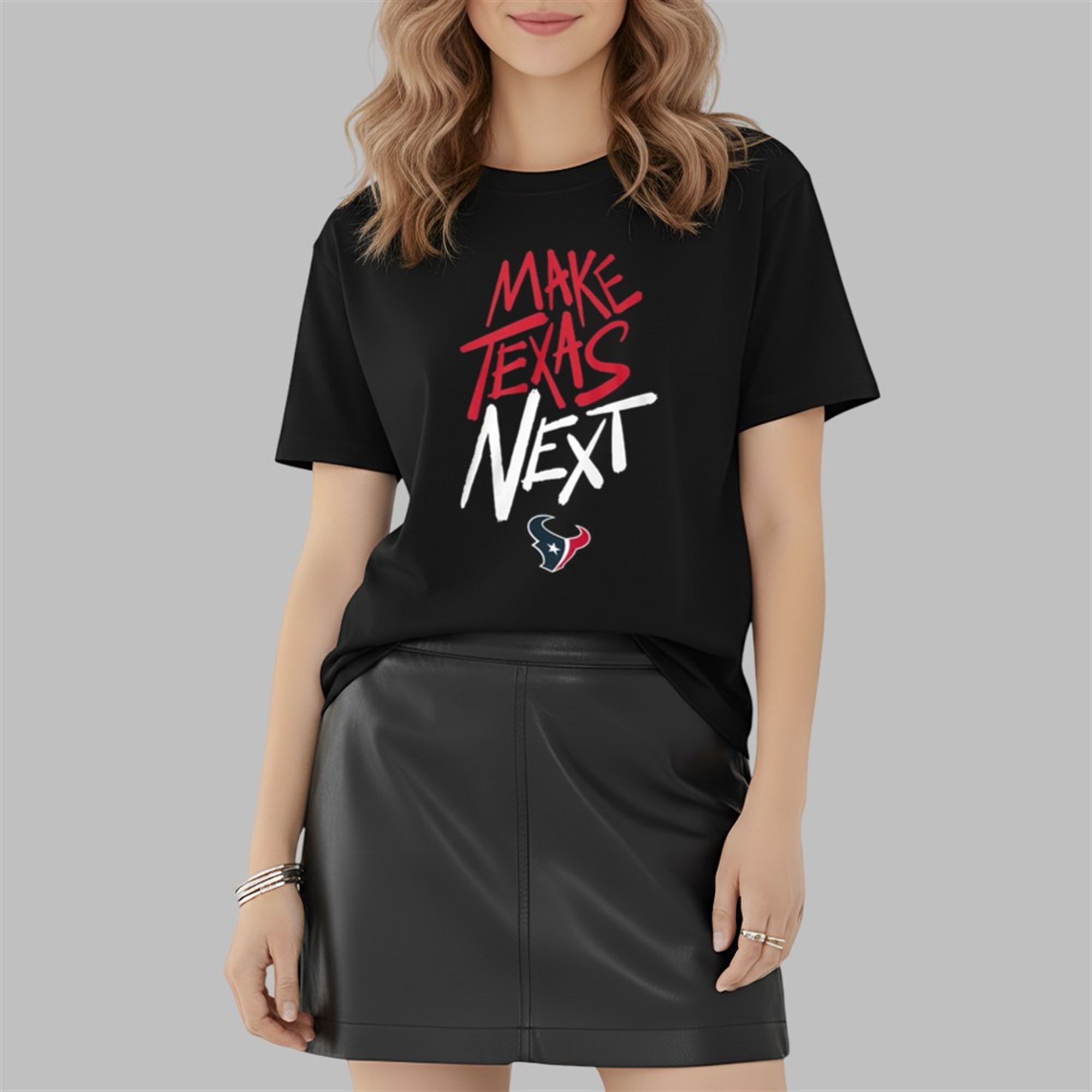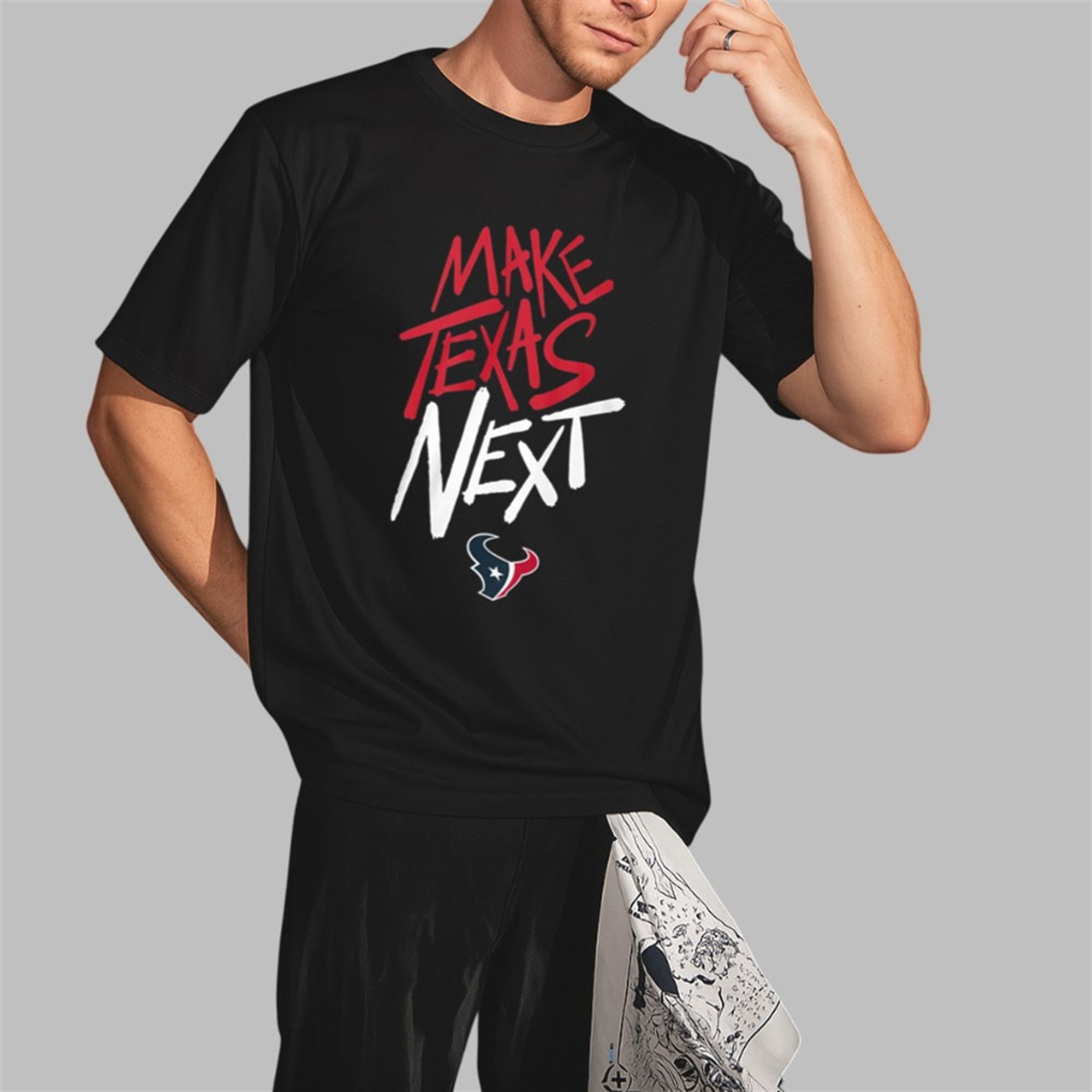 The shirt is more than just merchandise; it is a snapshot of Houston sports history. Featuring a bold, brush-stroke typography design in the team’s signature Battle Red and Deep Steel Blue, the graphic demands attention. The text “MAKE TEXAS” sits aggressively above a crisp white “NEXT,” anchored by the iconic Houston Texans bull logo.