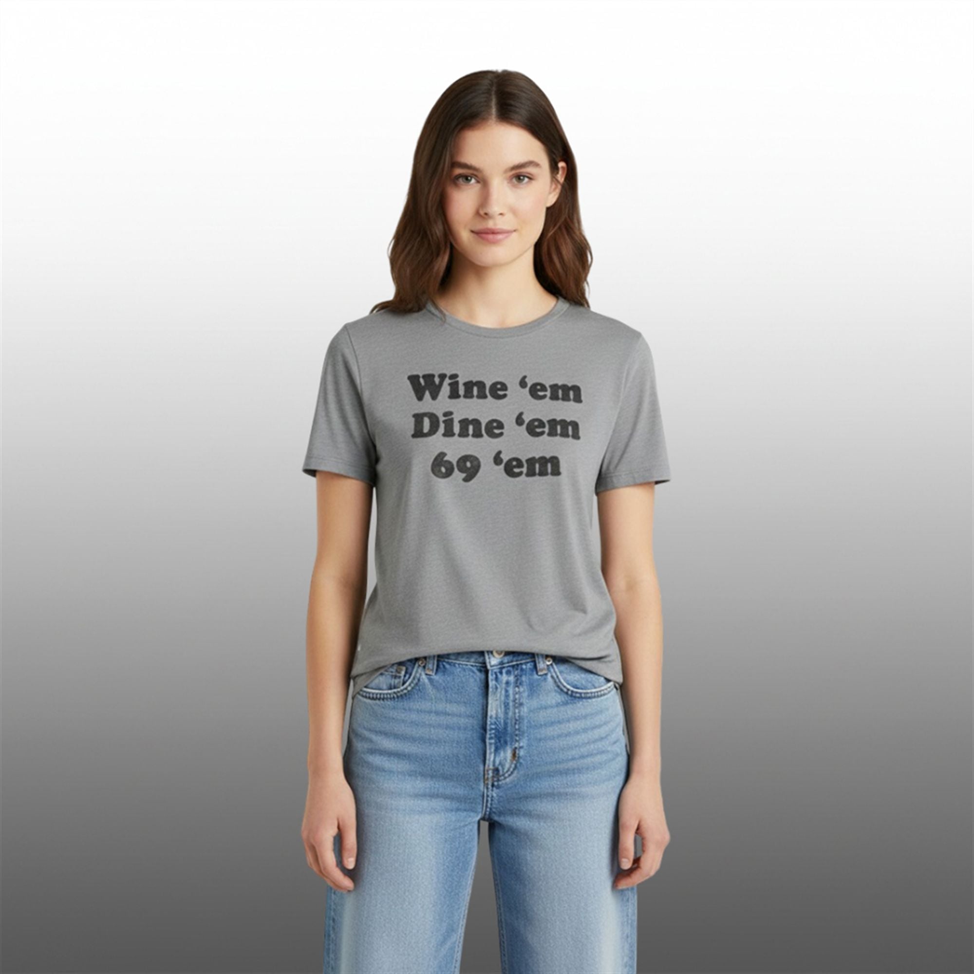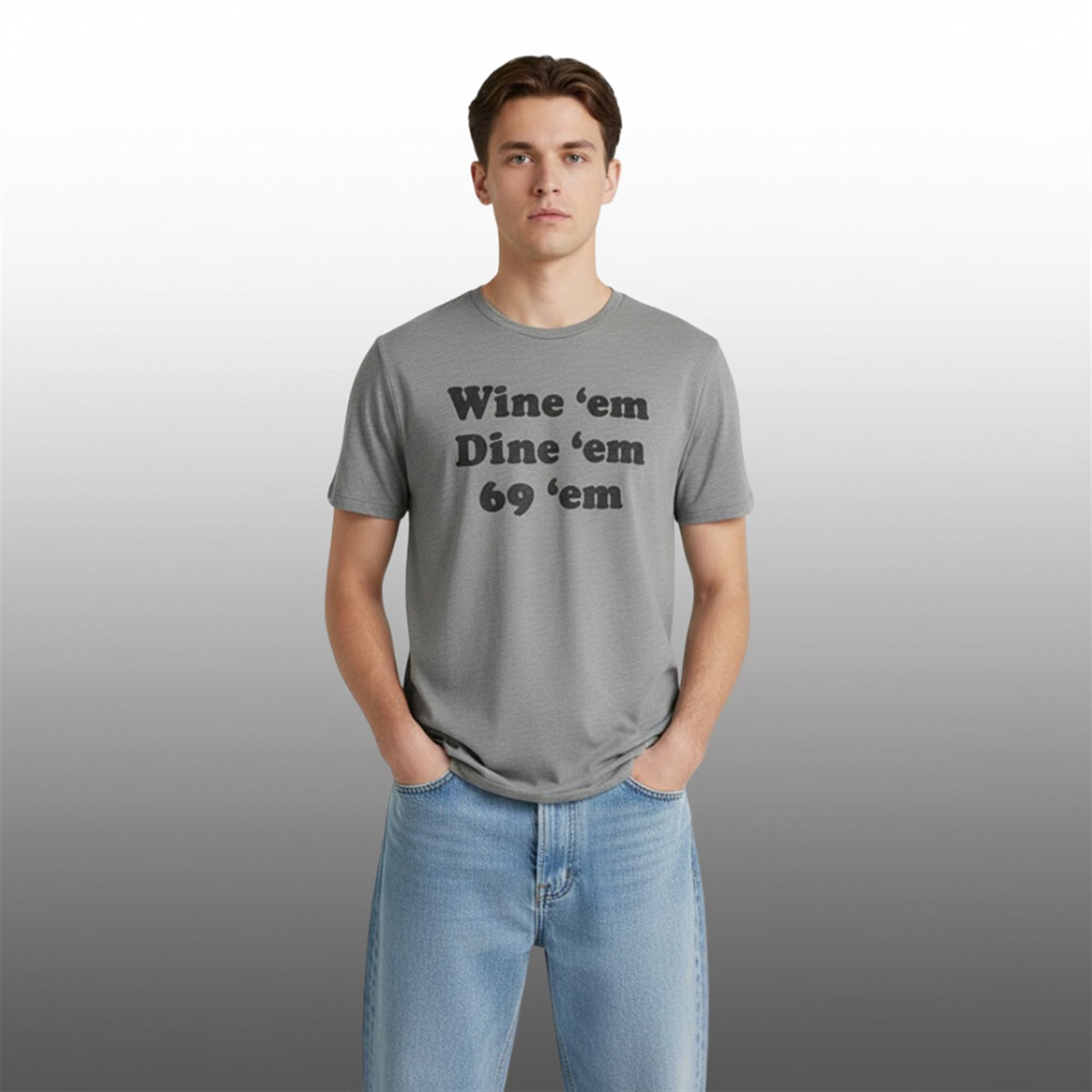 At first glance, the text “Wine Em Dine Em 69” appears to be a classic romantic checklist, but it quickly takes a sharp turn into adult humor. The phrase plays on the traditional idiom of “wining and dining” a romantic partner—treating them to drinks and a meal—but subverts expectations with a crude, rhyming conclusion. This “bait-and-switch” comedic structure is why the shirt works so well; it sets up a polite expectation and immediately shatters it with a bold, cheeky punchline. It represents a carefree, rebellious attitude that rejects seriousness in favor of a good laugh.