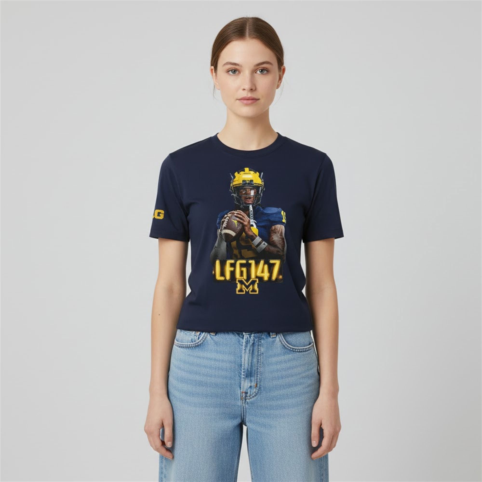 The front of the shirt features a dynamic, photorealistic graphic of Bryce Underwood in full game gear, gripping the football and scanning the field. The imagery is anchored by the neon-styled “LFG147” text—a code that has become synonymous with the aggressive, winning mindset of the new roster. The classic Block M logo sits proudly beneath, grounding the modern design in decades of tradition.
