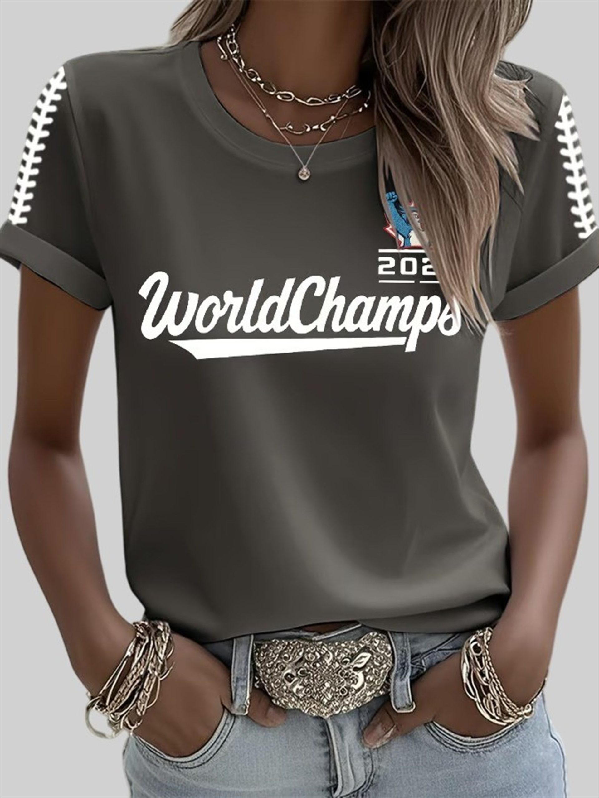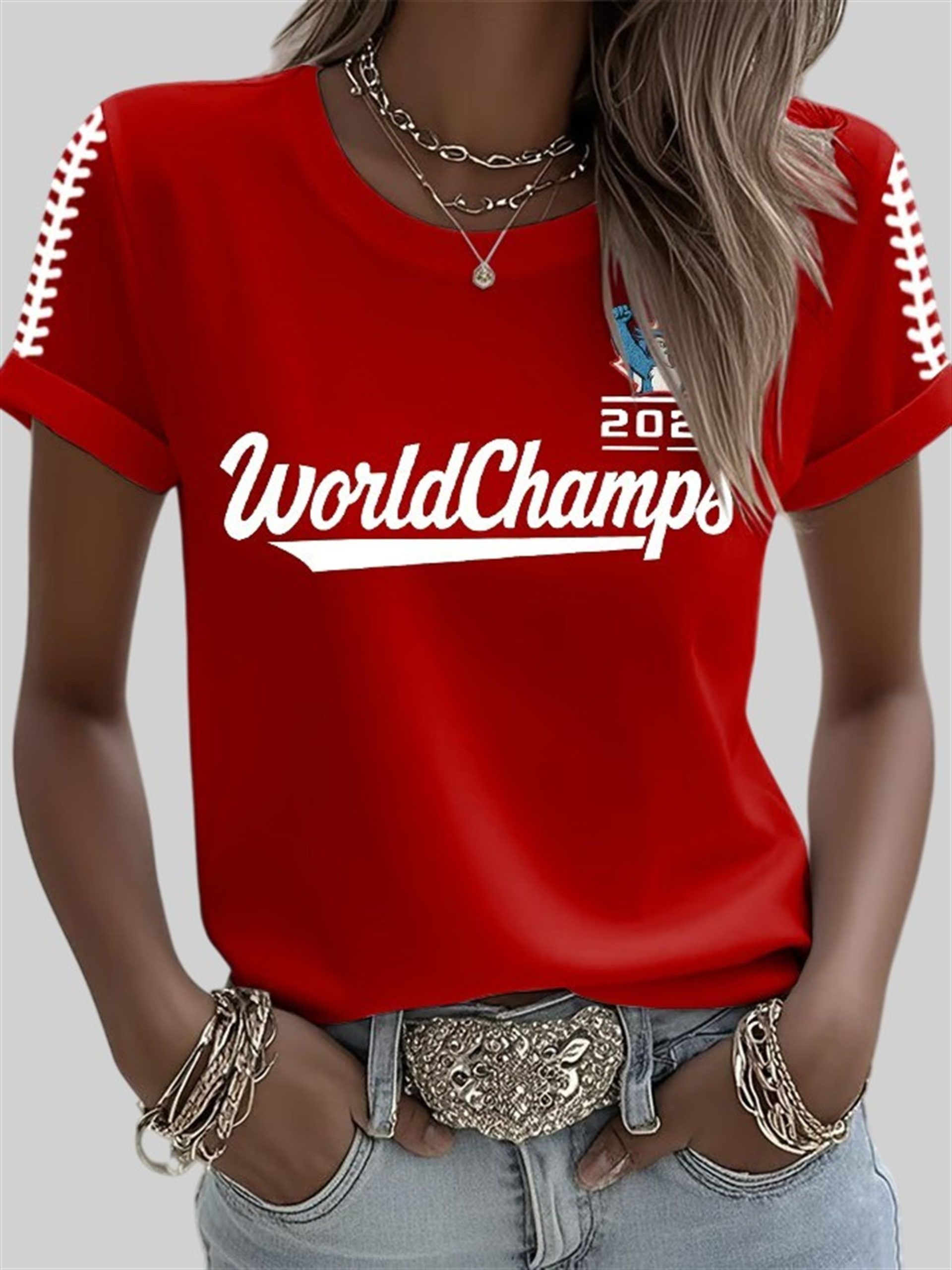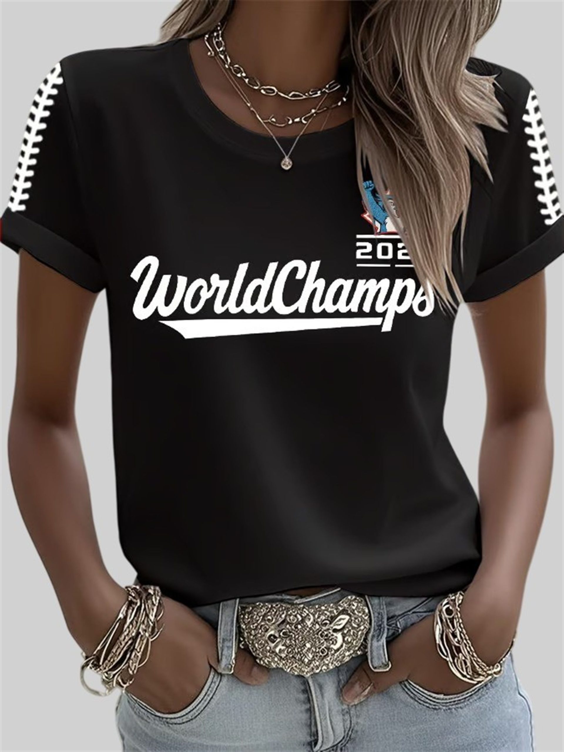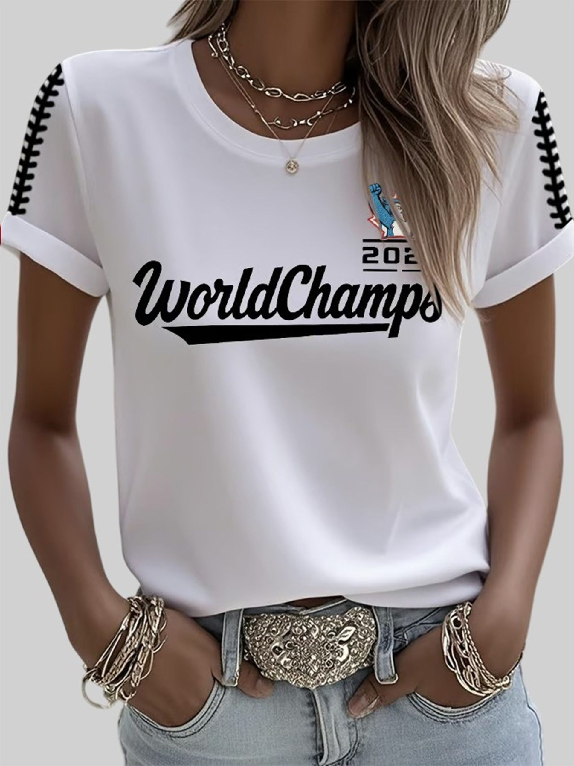 Own a piece of that history with the Women’s Blue Jays 2025 World Champs Printed Round Neck T-Shirt. This isn’t your average, one-size-fits-all souvenir. It’s a stylish, comfortable, and celebratory piece designed specifically for the female fan who wants to look as good as this victory feels.