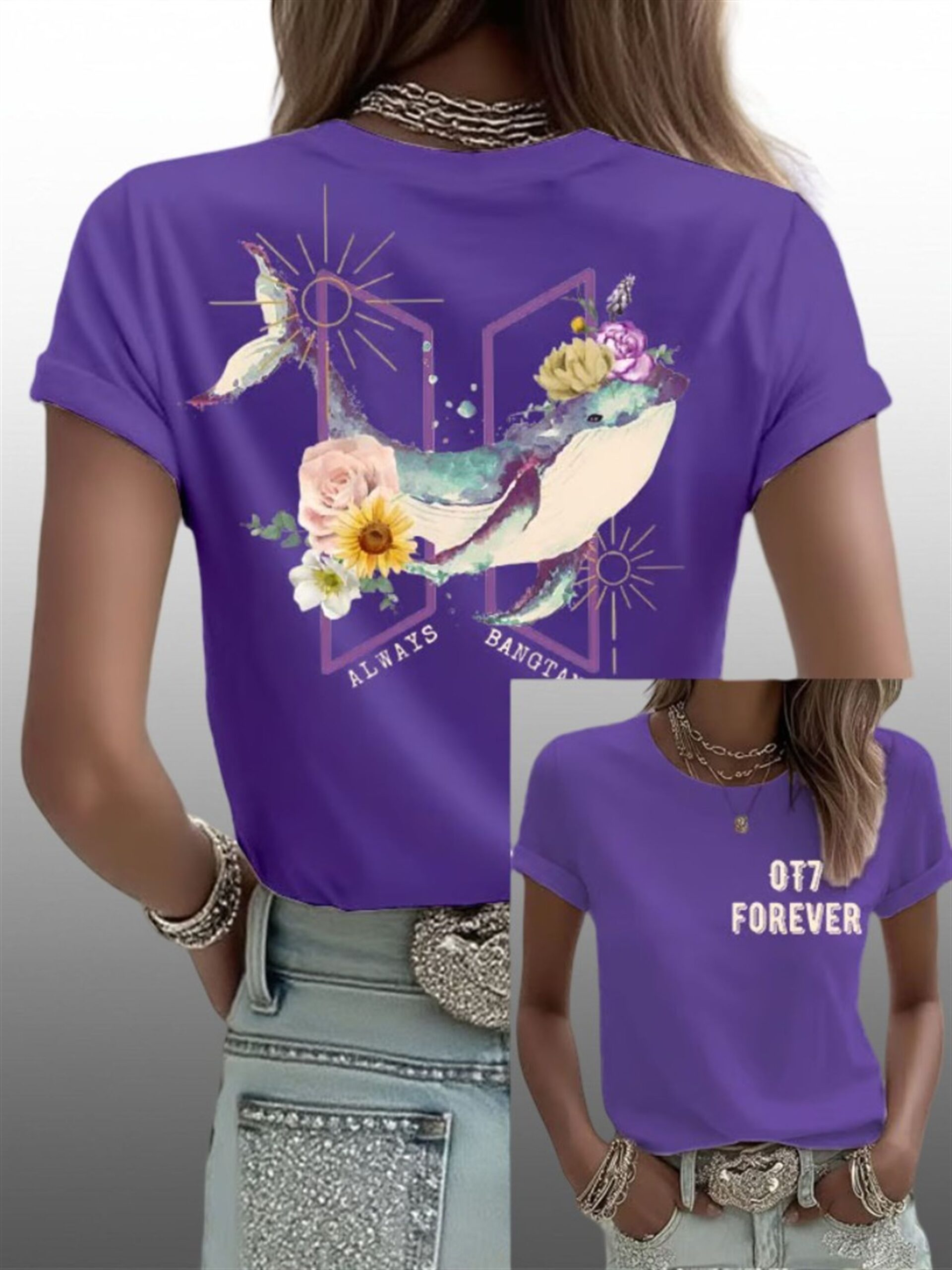 As the global spotlight returns to the legends of K-Pop in 2026, the shirt has emerged as the definitive symbol of loyalty for ARMYs worldwide. This isn’t just merchandise; it is a wearable manifesto of the promise to stay “Gold” forever. Featuring the iconic “Whalien 52” imagery intertwined with blooming florals and the sacred “7” symbolism, this top captures the journey from loneliness to a galaxy of purple lights.