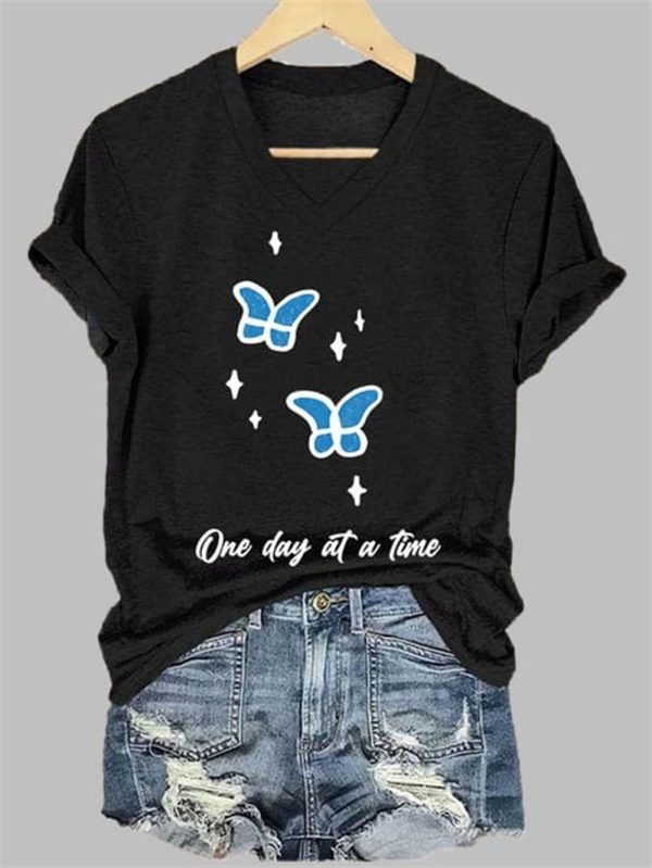 Women’s Butterfly One Day At A Time Printed V Neck T-shirt – Embrace Serenity