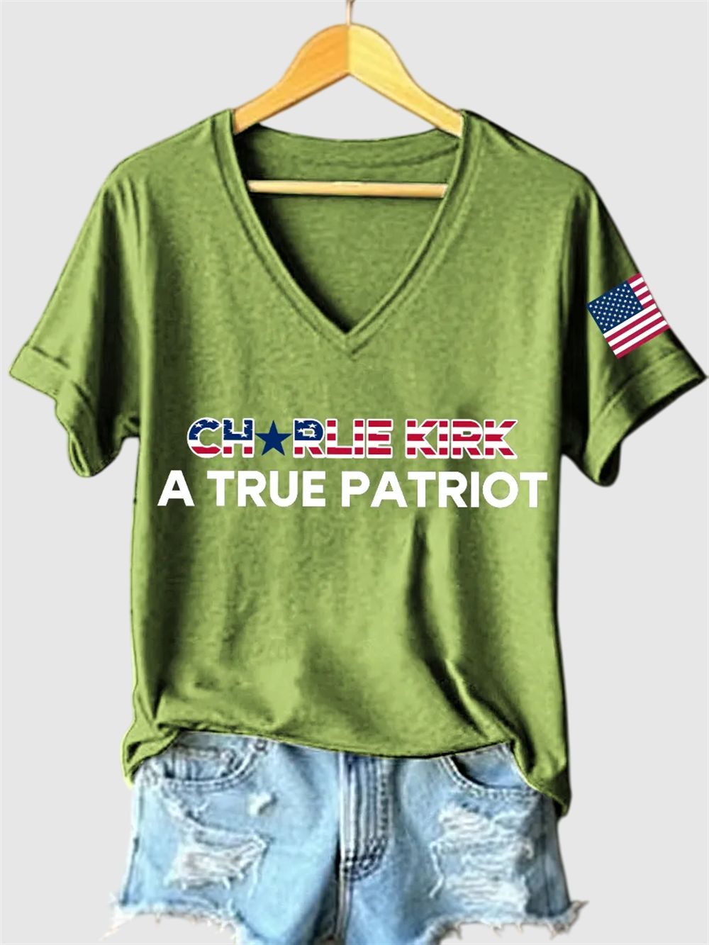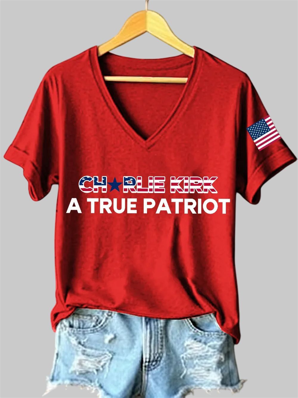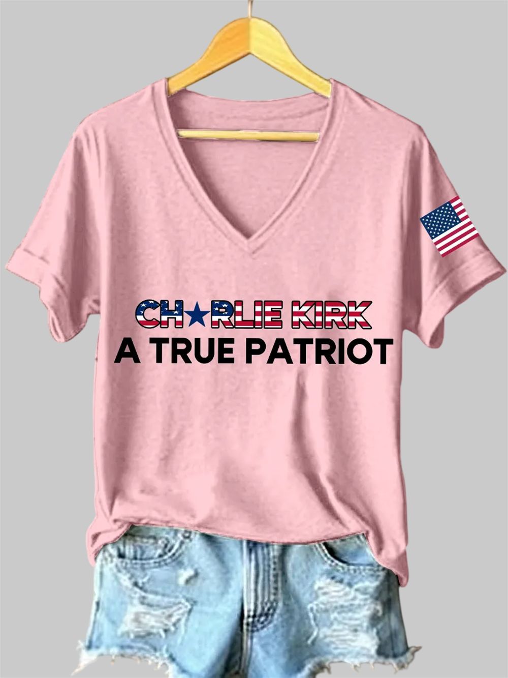 Women’s Charlie Kirk A True Patriot Print V-Neck T-Shirt | Declare Your Values with Unwavering Pride