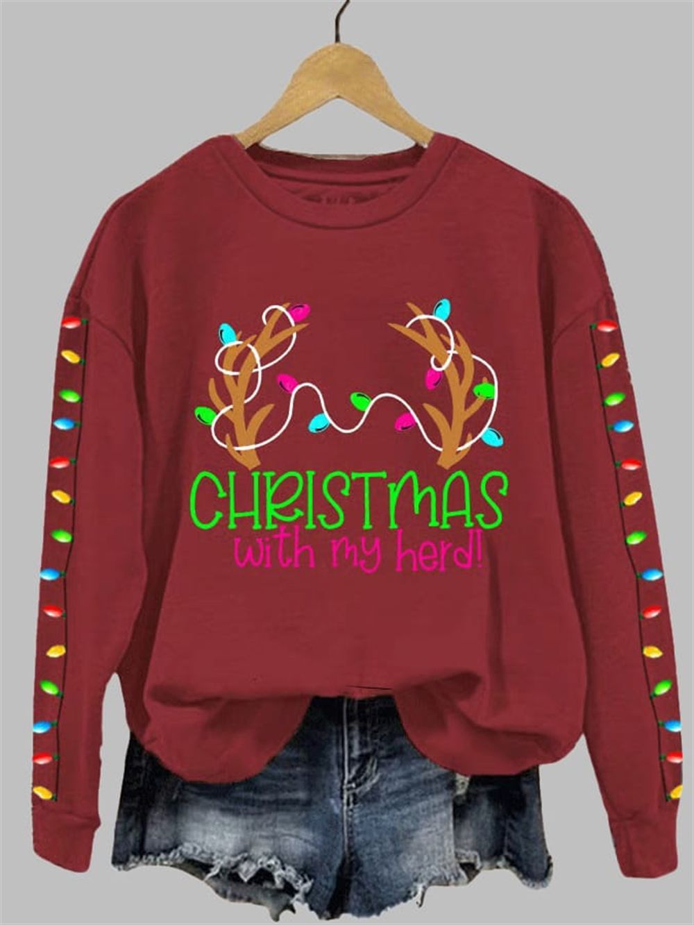 What sets this sweatshirt apart is its enchanting and utterly unique design. The centerpiece is a whimsical graphic featuring reindeer antlers playfully tangled in a string of colorful Christmas lights, perfectly capturing the fun and chaos of the holidays. Below this, the cheerful message “CHRISTMAS with my herd!” is printed in vibrant green and pink fonts, celebrating the joy of togetherness. But the real showstopper is the sleeves! Each arm is adorned with a continuous string of colorful holiday bulbs, creating a stunning visual effect that mimics festive lights and guarantees you’ll stand out at any party, cookie exchange, or family gathering.