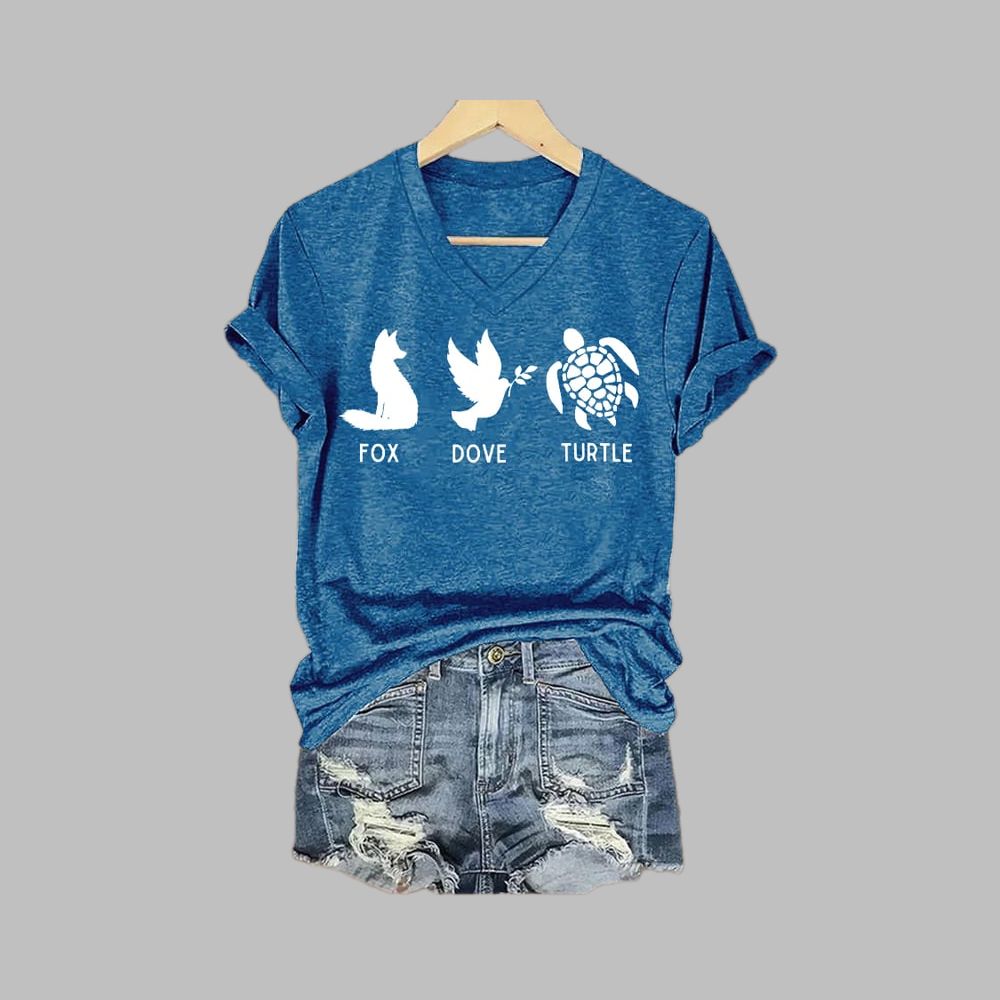 Choosing this Fox, Dove, and Turtle tee means opting for a unique blend of style, comfort, and personal expression. Unlike generic graphic tees, this design offers a specific and charming nod to the natural world. The flattering V-neck cut elevates it beyond a basic crew neck, while the soft-touch fabric ensures lasting comfort. It’s a conversation starter, a reflection of your love for nature, and a versatile piece that pairs effortlessly with your favorite jeans, shorts, or skirts. It also makes a thoughtful gift for the nature enthusiast in your life.