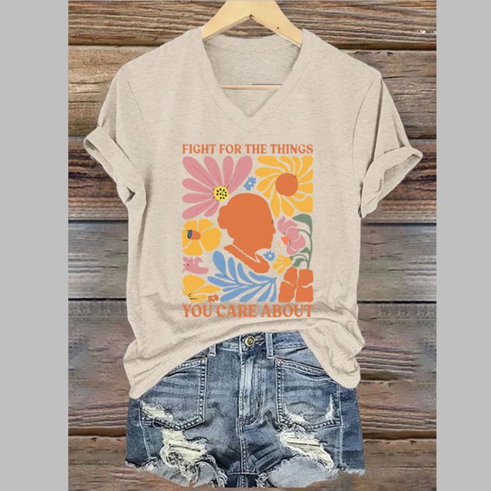 This Women’s Fight For The Things You Care About Print T-Shirt isn’t just another graphic tee; it’s wearable art with a purpose. At the heart of the design lies the empowering phrase, “Fight For The Things You Care About.” Rendered in a font that evokes a sense of timeless conviction, possibly with a retro flair, the message is clear and resonant. It serves as a daily reminder of your own strength and the importance of advocating for your beliefs, causes, and passions.