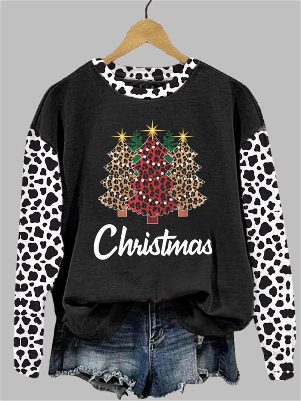 The magic of this sweatshirt lies in its captivating and unconventional design. Set against a classic black bodice, the central graphic immediately draws the eye. It features a trio of stylized Christmas trees, two of which are adorned with a fierce and fashionable leopard print. The central tree pops with a vibrant red hue and is decorated with charming string lights, adding a classic touch of holiday sparkle. Below this stunning graphic, the word “Christmas” is elegantly scripted, anchoring the festive theme. But the true showstopper is the sleeves—adorned with a bold black-and-white cow print, they create a stunning contrast and an unforgettable fashion moment.