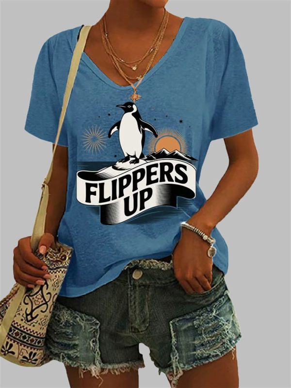 Women’s Penguins Flippers Up Print V Neck Casual T-Shirt – Catch the Wave