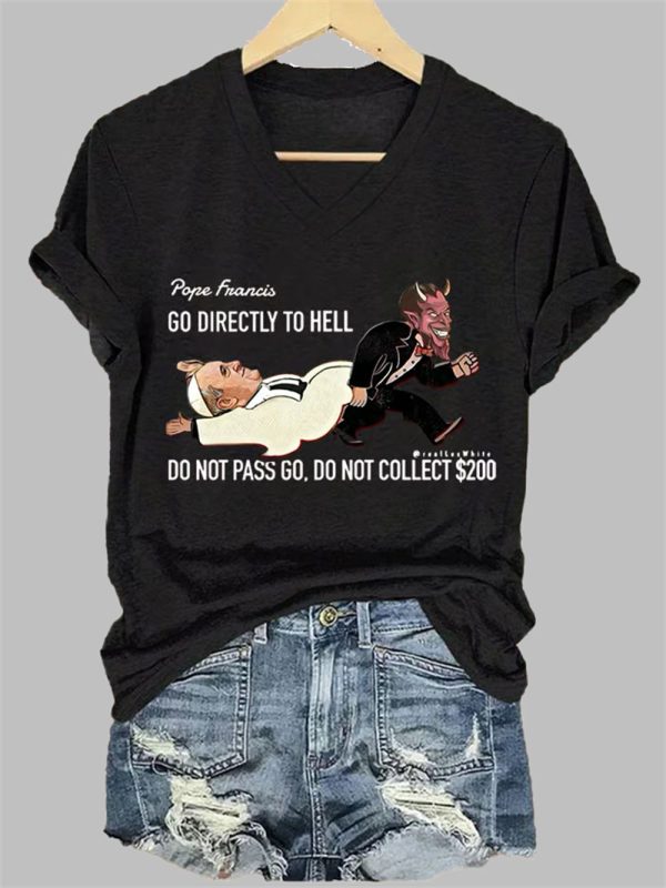 Make a truly bold statement with this Women’s Pope Francis Go Direcly To Hell Print Casual T-Shirt. Featuring a provocative design riffing on Pope Francis, the classic Monopoly game, and a trip downstairs, this tee is crafted for those who embrace dark humor and aren’t afraid to challenge conventions. Shop daring graphic tees now.